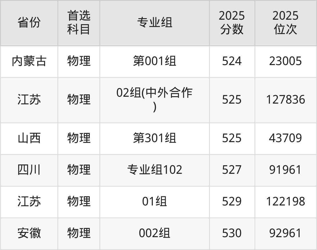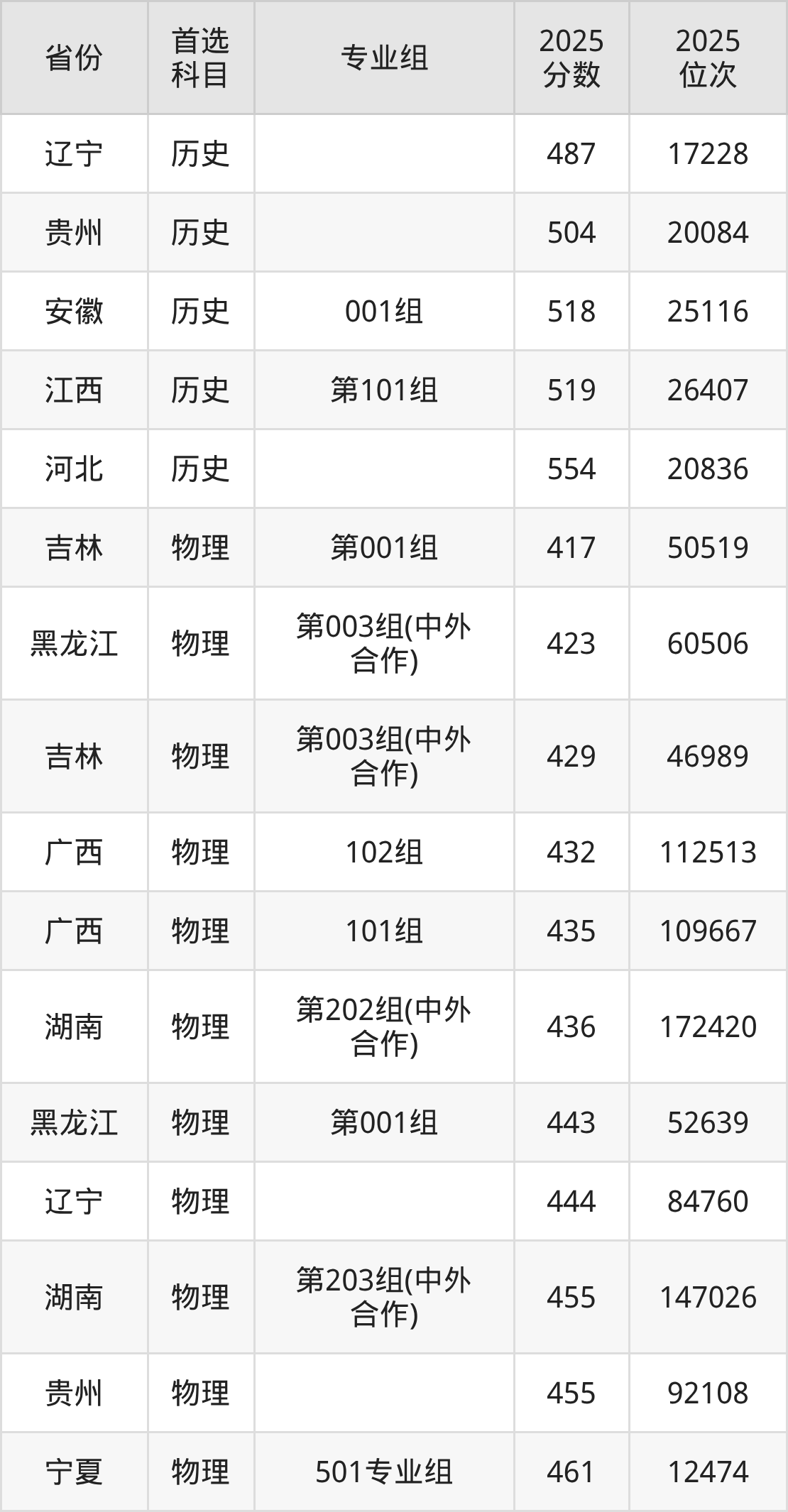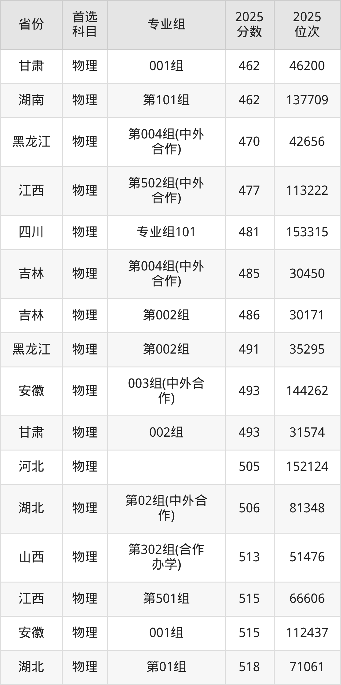 物理类最低分对应地区为吉林(第001组),录取位次为50519,超本科线77分;最高分对应地区为安徽(002组),录取位次为92961,超本科线69分。