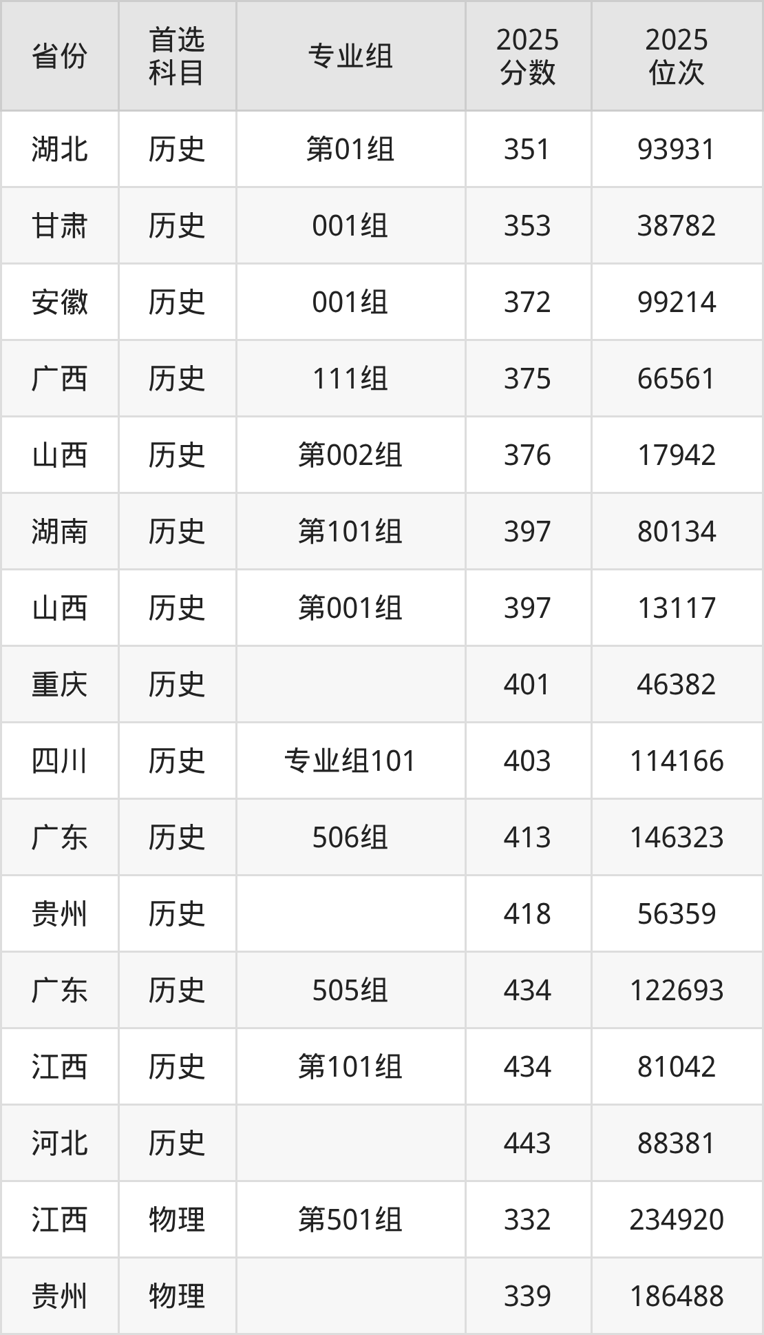 历史类最低分对应地区为湖北(第01组),录取位次为93931,超专科线151分;最高分对应地区为河北,录取位次为88381,超专科线243分。