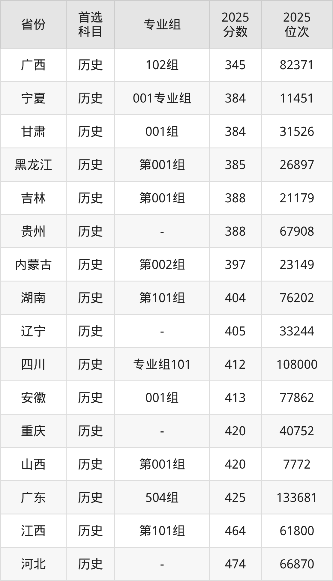 历史类最低分对应地区为广西(102组),录取位次为82371,超专科线145分;最高分对应地区为河北,录取位次为66870,超专科线274分。