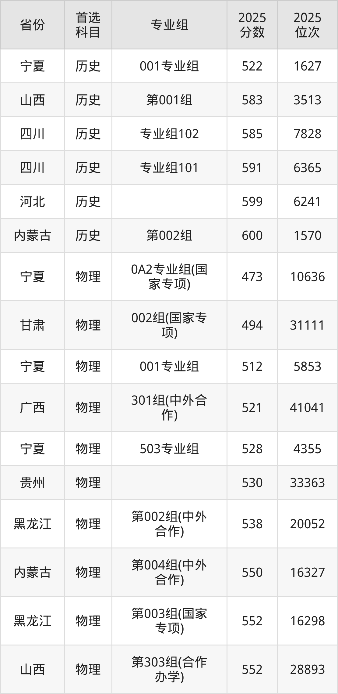 历史类最低分对应地区为宁夏(001专业组),录取位次为1627,超本科B118分;最高分对应地区为内蒙古(第002组),录取位次为1570,超本科线182分。