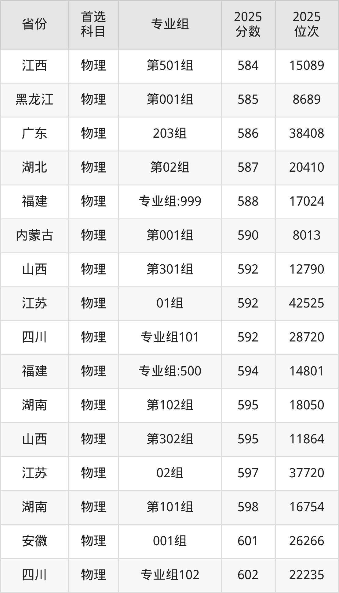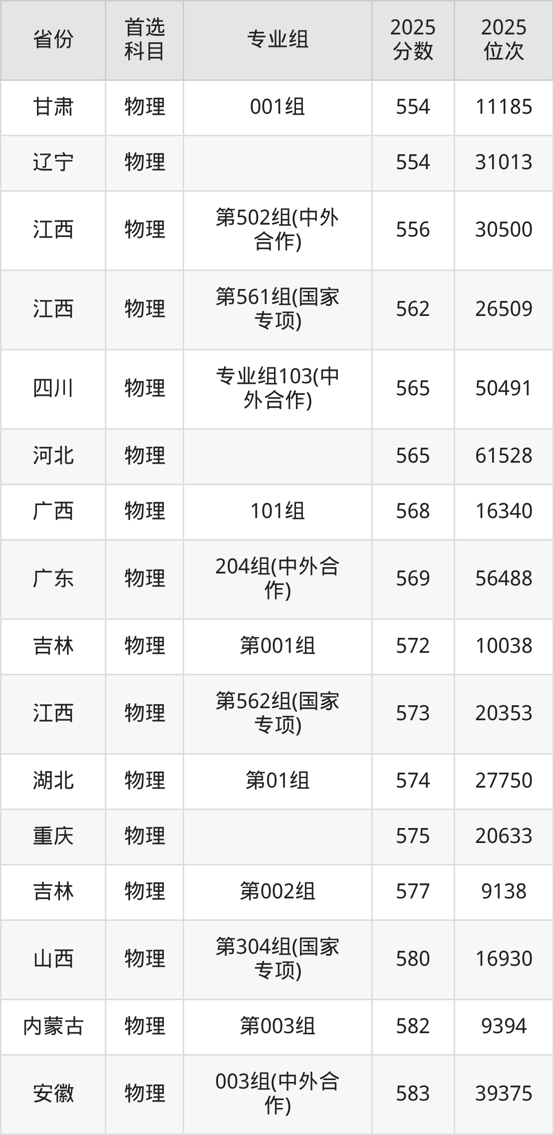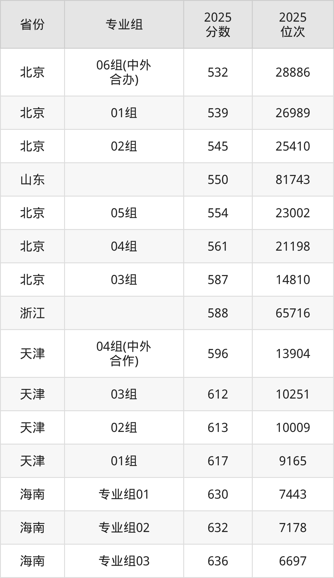 01组539分、26989名,02组545分、25410名,03组587分、14810名,04组561分、21198名,05组554分、23002名,06组(中外合办)532分、28886名;