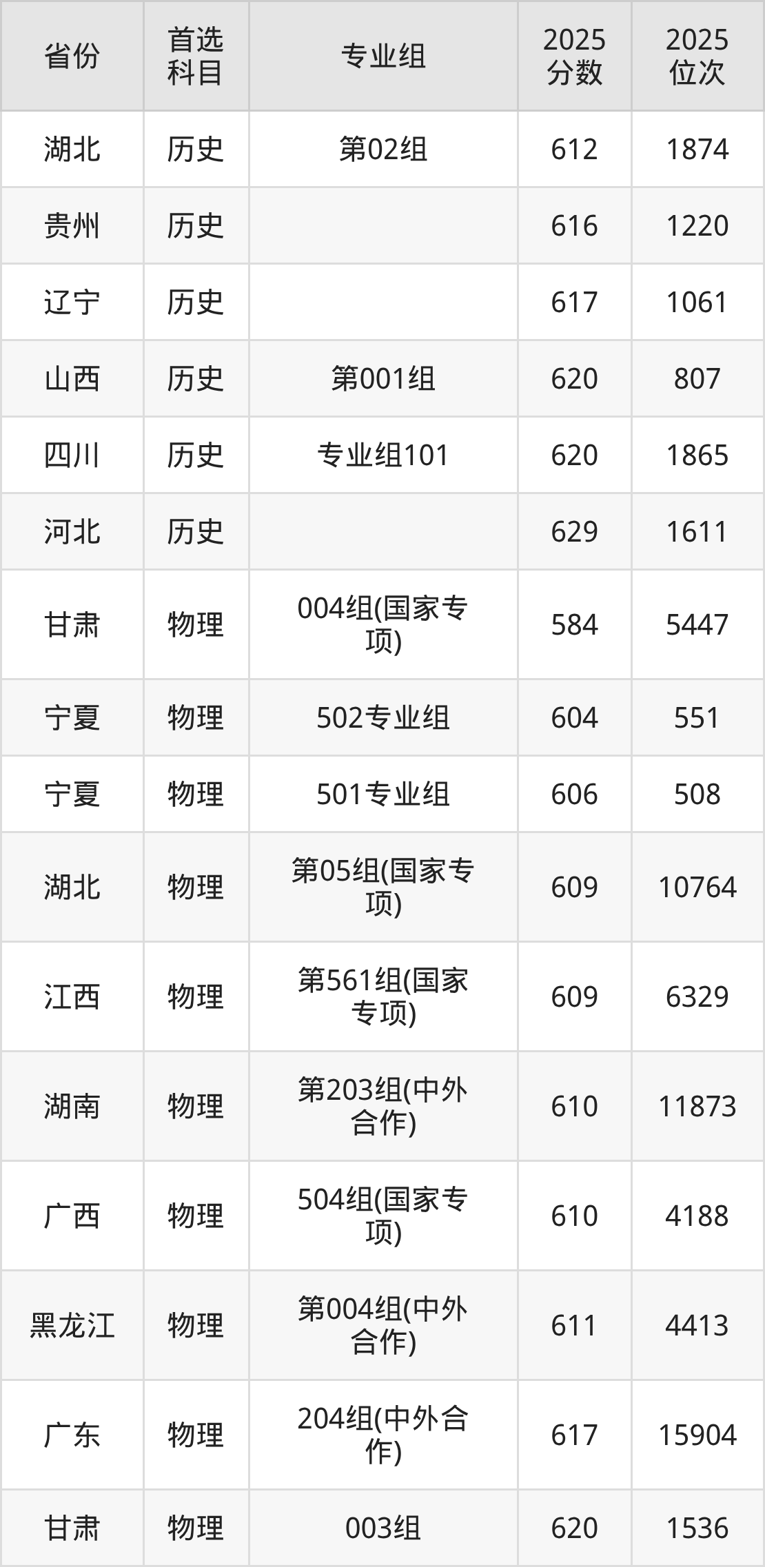 历史类最低分对应地区为湖北(第02组),录取位次为1874;最高分对应地区为河北,录取位次为1611,超本科线152分。