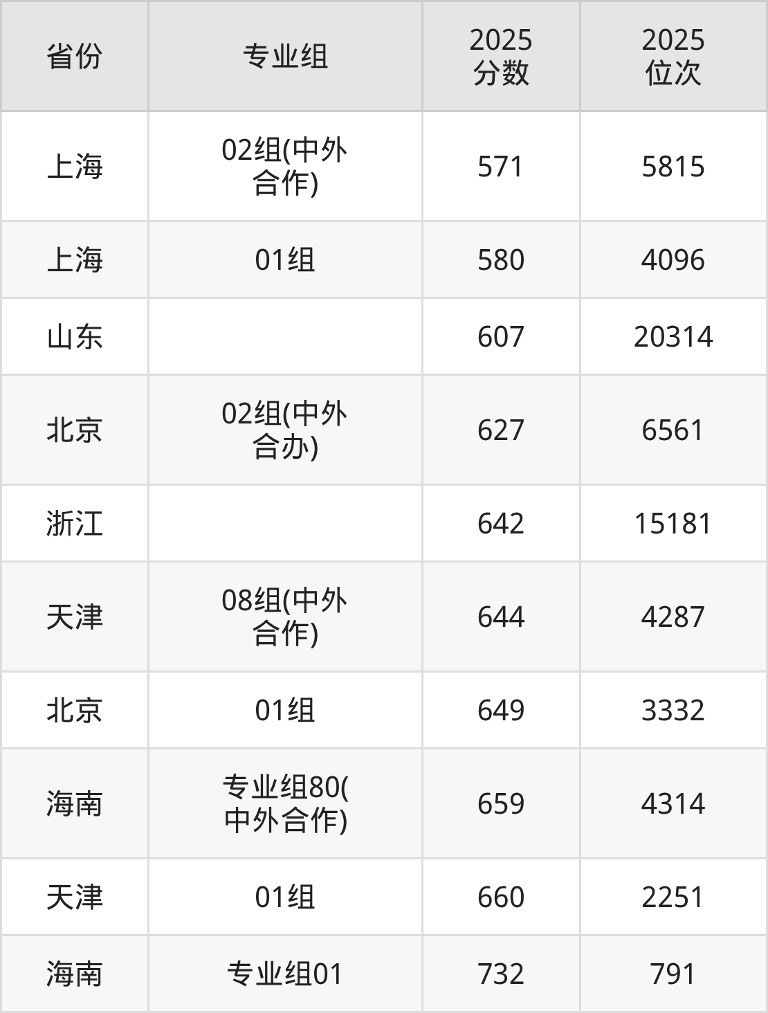 最低分对应地区为上海(02组(中外合作)),录取位次为5815,超本科线169分;最高分对应地区为海南(专业组01),录取位次为791,超本科线252分。