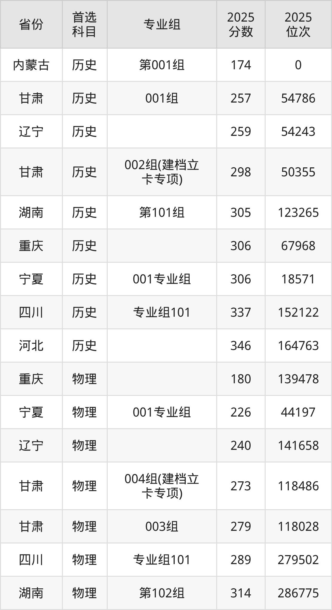2025年石河子工程职业技术学院在新高考3+1+2地区的录取分数线为:历史类174分-346分、物理类180分-320分。