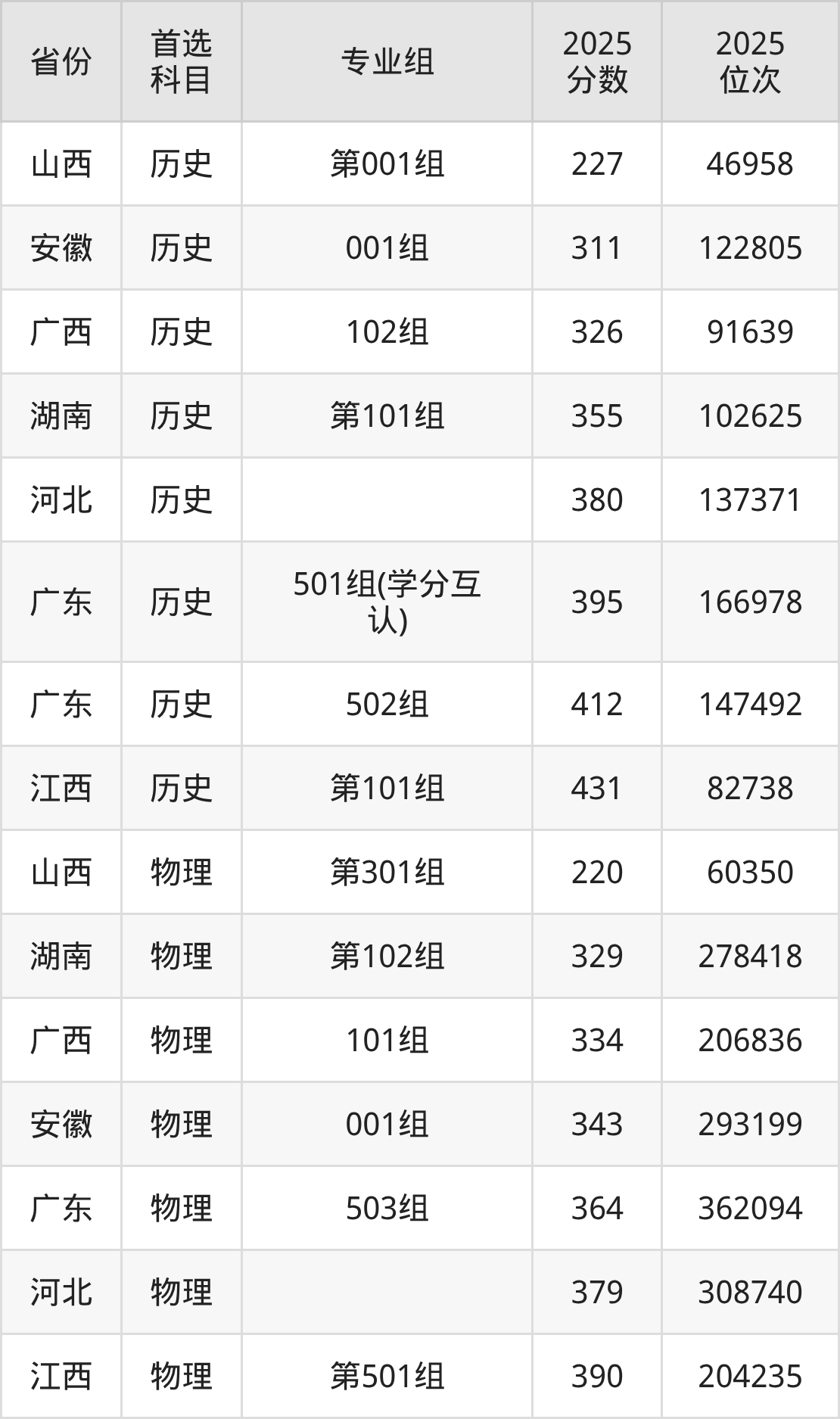 物理类最低分对应地区为山西(第301组),录取位次为60350;最高分对应地区为江西(第501组),录取位次为204235。