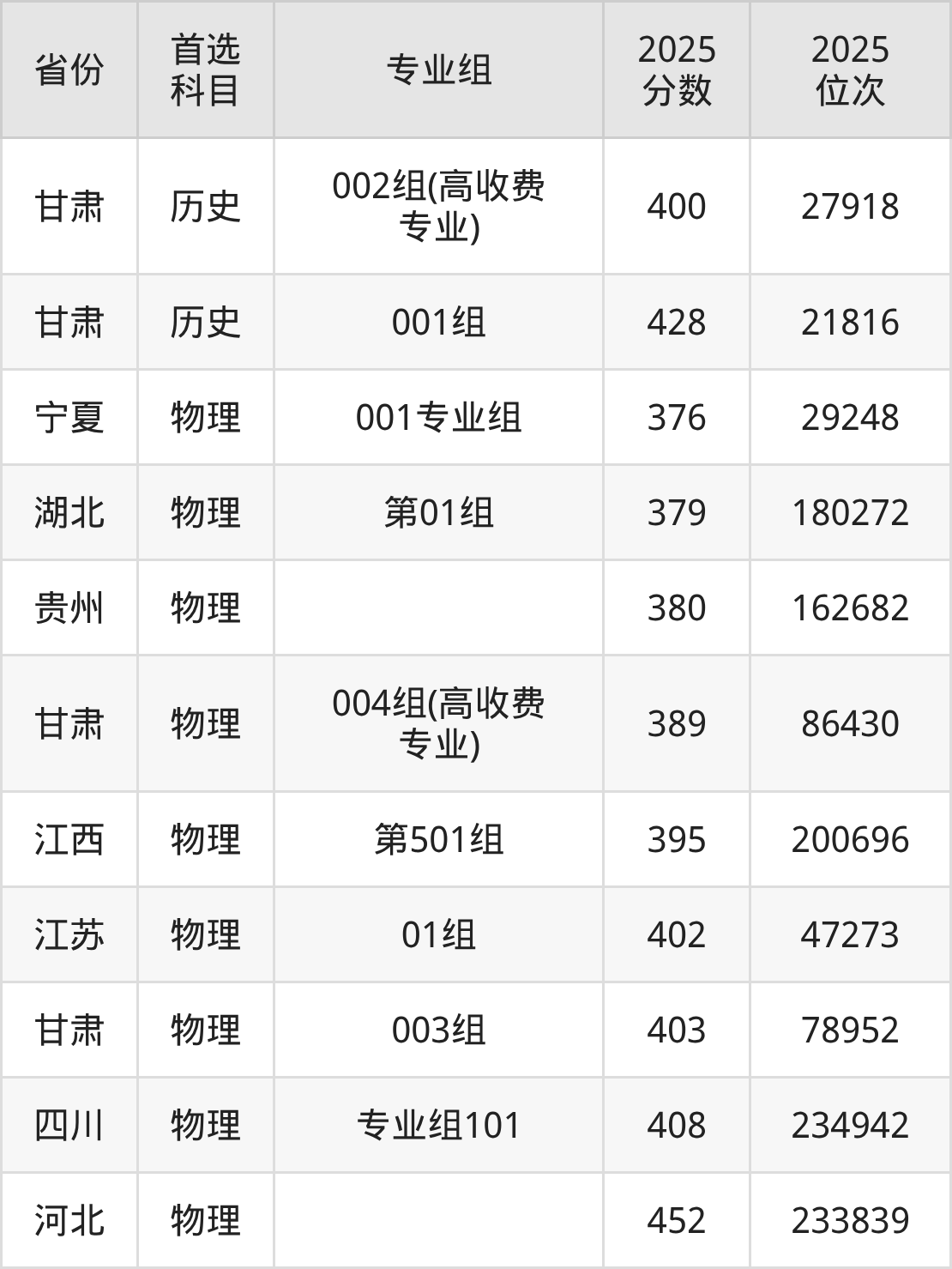 历史类最低分对应地区为甘肃(002组(高收费专业)),录取位次为27918;最高分对应地区为甘肃(001组),录取位次为21816,超专科线268分。