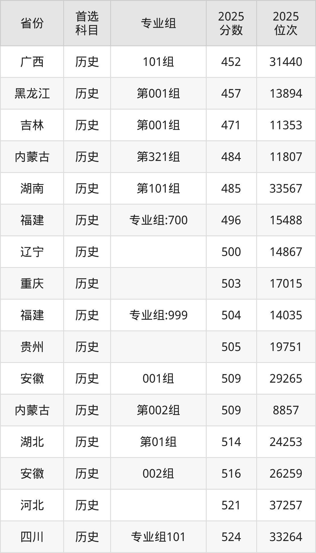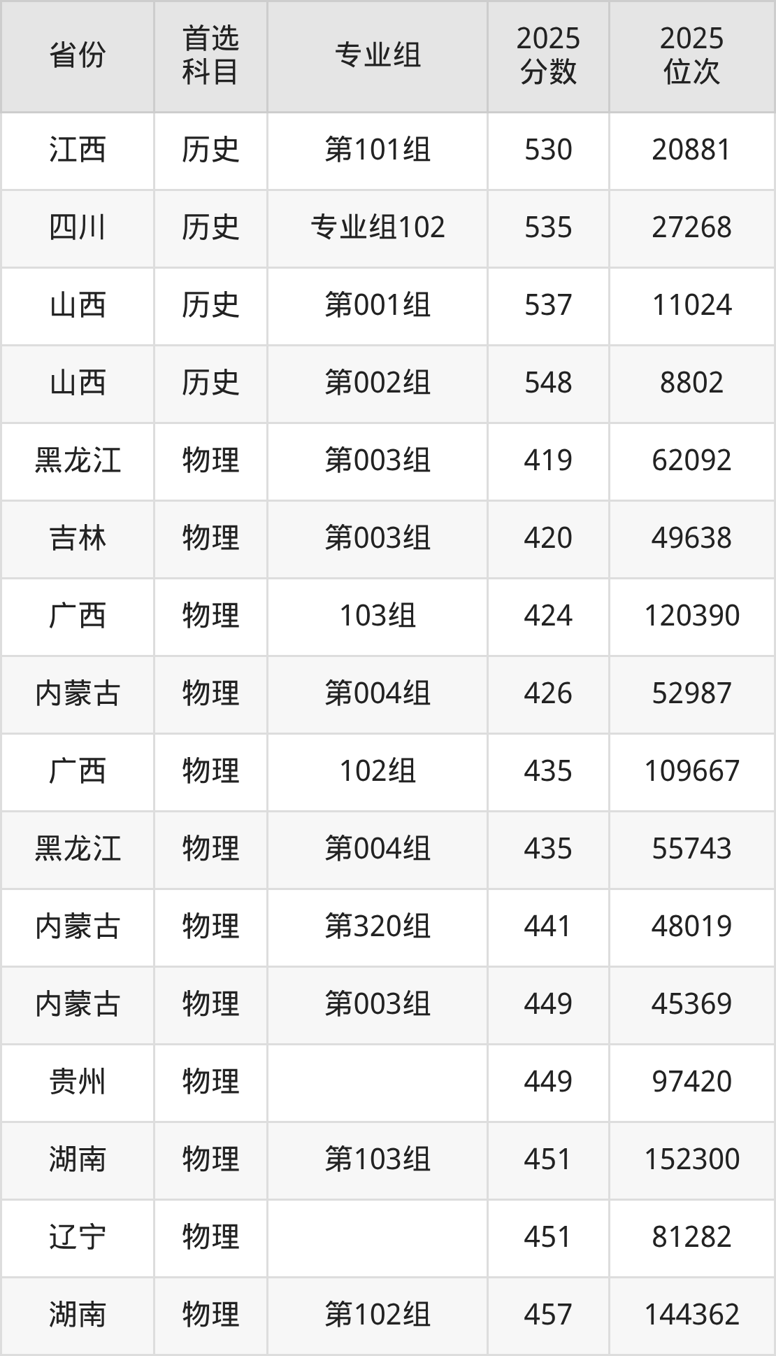 历史类最低分对应地区为广西(101组),录取位次为31440;最高分对应地区为山西(第002组),录取位次为8802,超本科线105分。