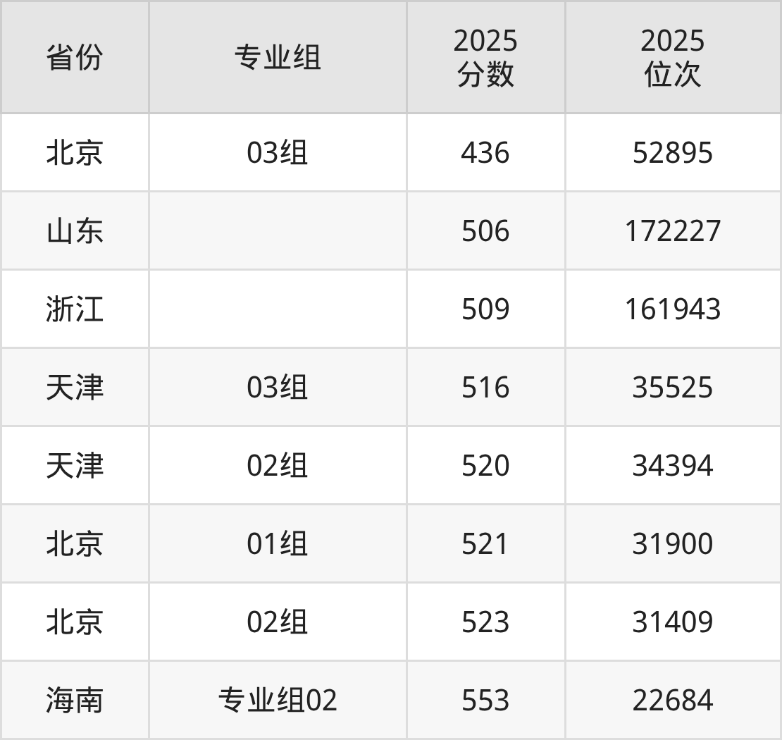 最低分对应地区为北京(03组),录取位次为52895,超本科线6分;最高分对应地区为海南(专业组02),录取位次为22684,超本科线73分。