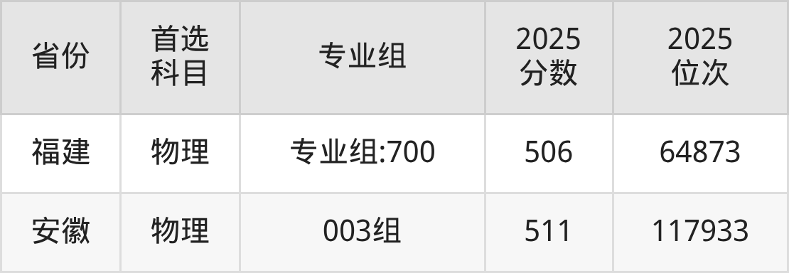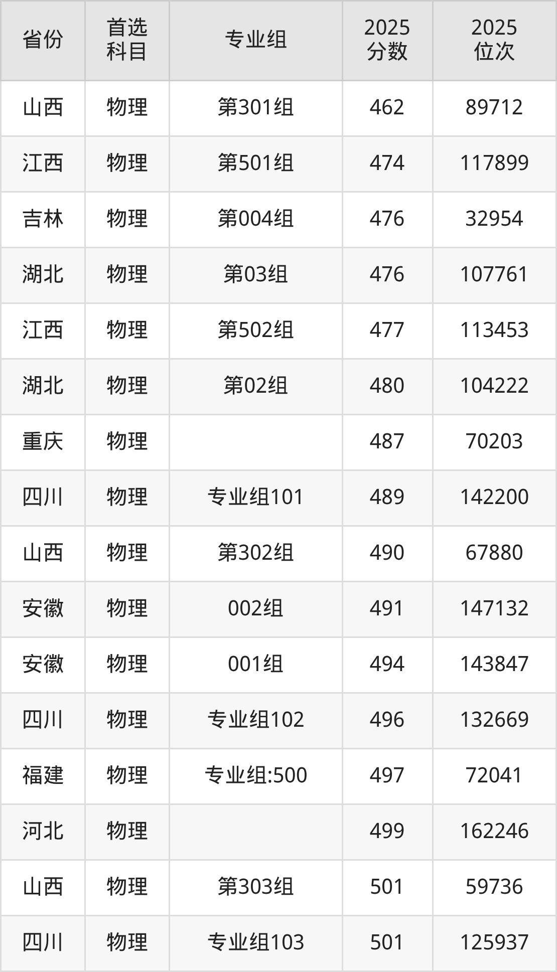 物理类最低分对应地区为黑龙江(第003组),录取位次为62092,超本科线59分;最高分对应地区为安徽(003组),录取位次为117933。
