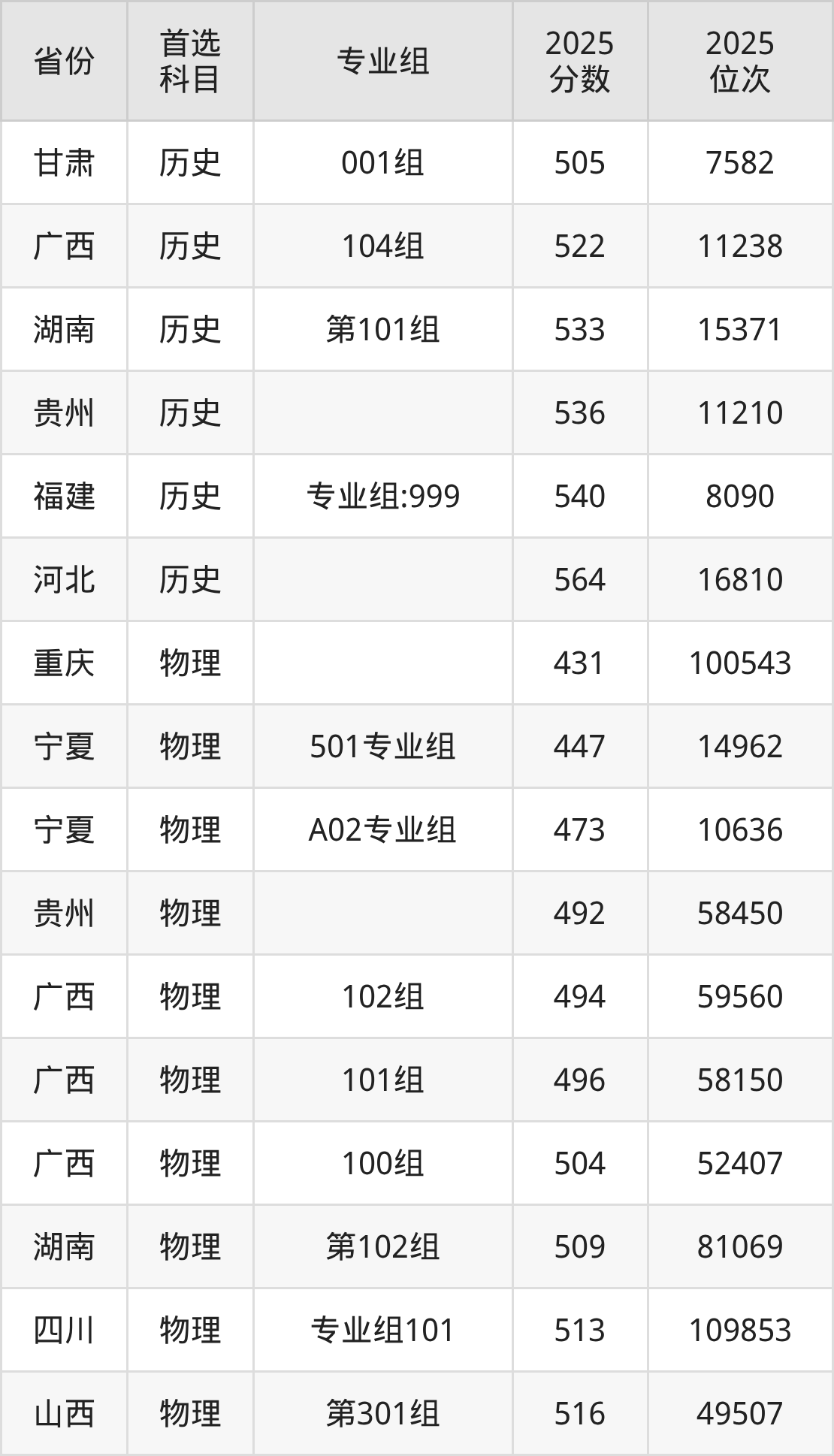 历史类最低分对应地区为甘肃(001组),录取位次为7582,超本科线93分;最高分对应地区为河北,录取位次为16810,超本科线87分。