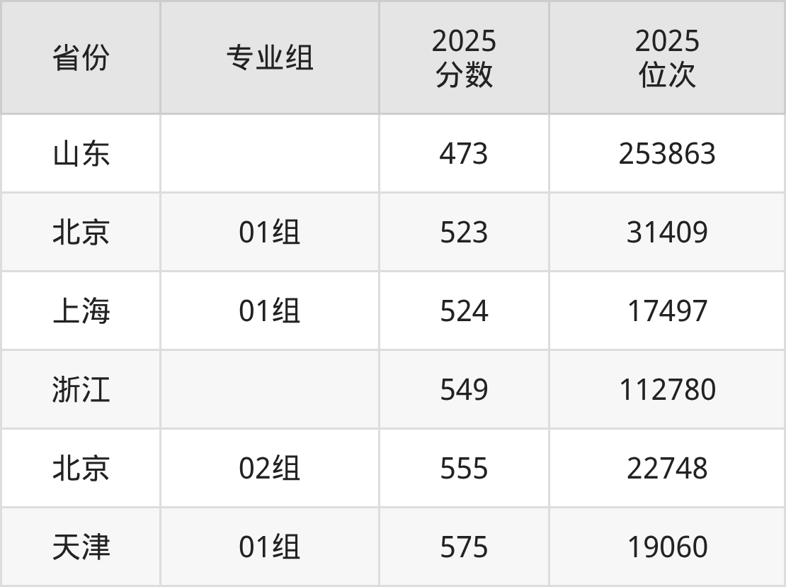 最低分对应地区为山东,录取位次为253863,超一段线32分;最高分对应地区为天津(01组),录取位次为19060,超本科线99分。