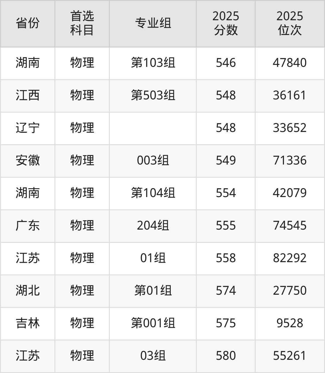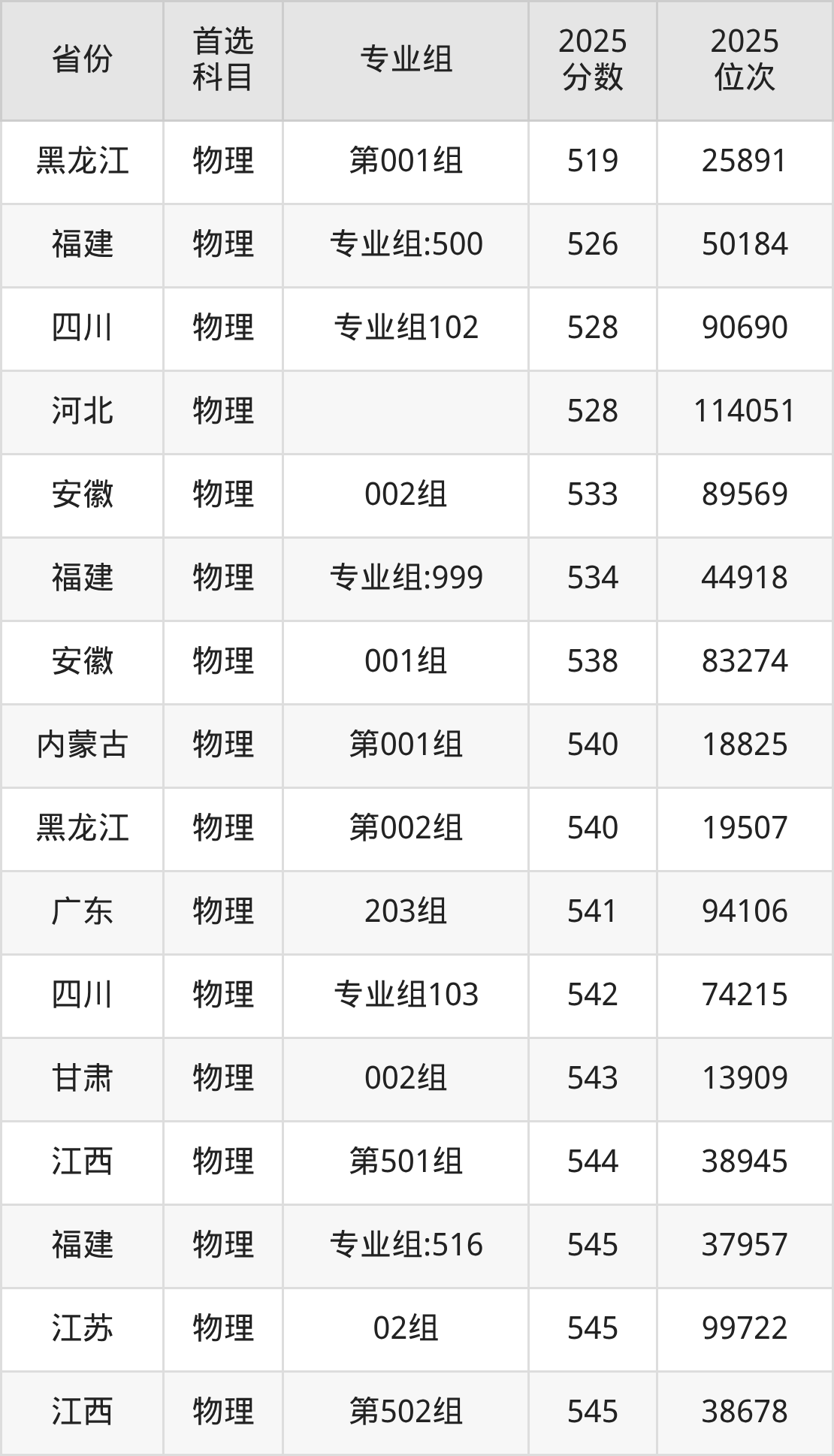 物理类最低分对应地区为重庆,录取位次为100543,超本科线91分;最高分对应地区为江苏(03组),录取位次为55261,超本科线117分。