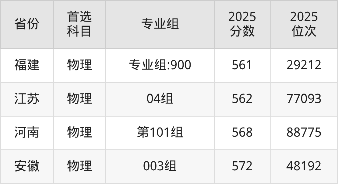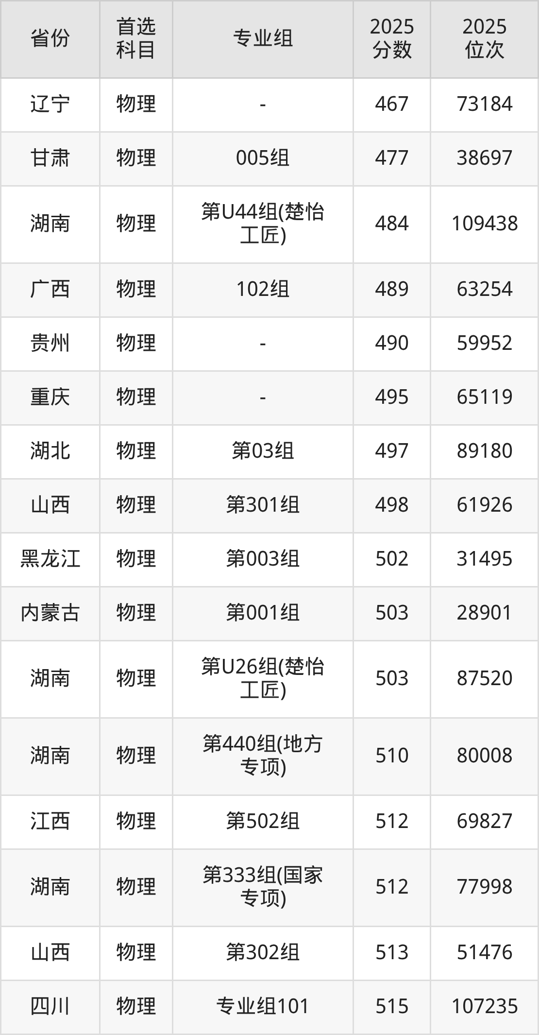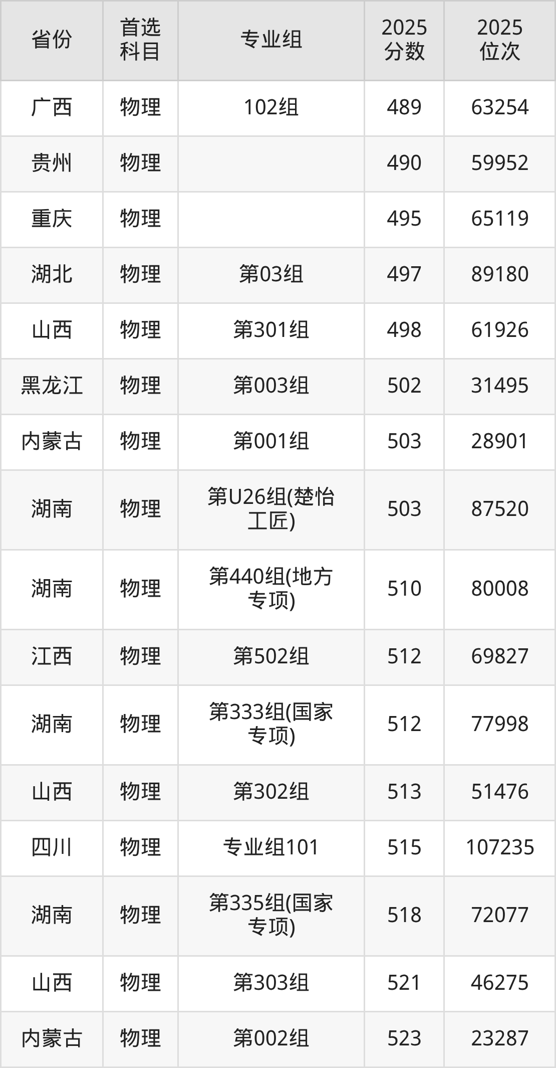 物理类:第123组527分、63627名,第124组543分、50163名,第125组542分、50973名,第127组530分、61016名,第128组539分、53361名,第333组(国家专项)512分、77998名,第334组(国家专项)525分、65455名,第335组(国家专项)518分、72077名,第336组(国家专项)529分、61880名,第440组(地方专项)510分、80008名,第441组(地方专项)524分、66377名,第442组(地方专项)535分、56712名,第443组(地方专项)538分、54204名,第U26组(楚怡工匠)503分、87520名,第U44组(楚怡工匠)484分、109438名;