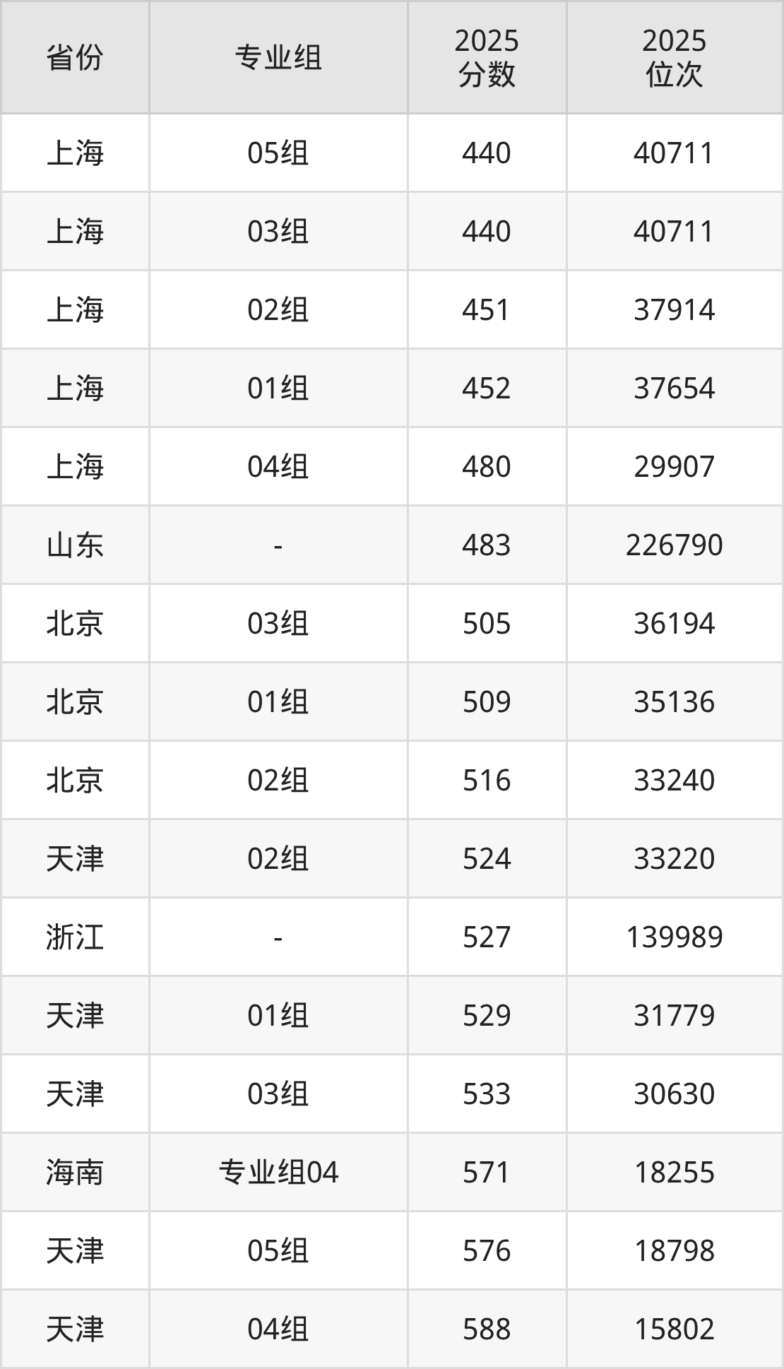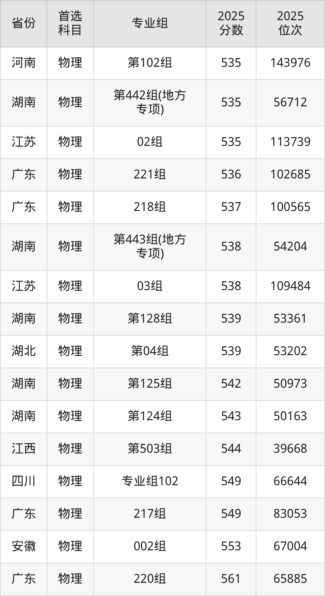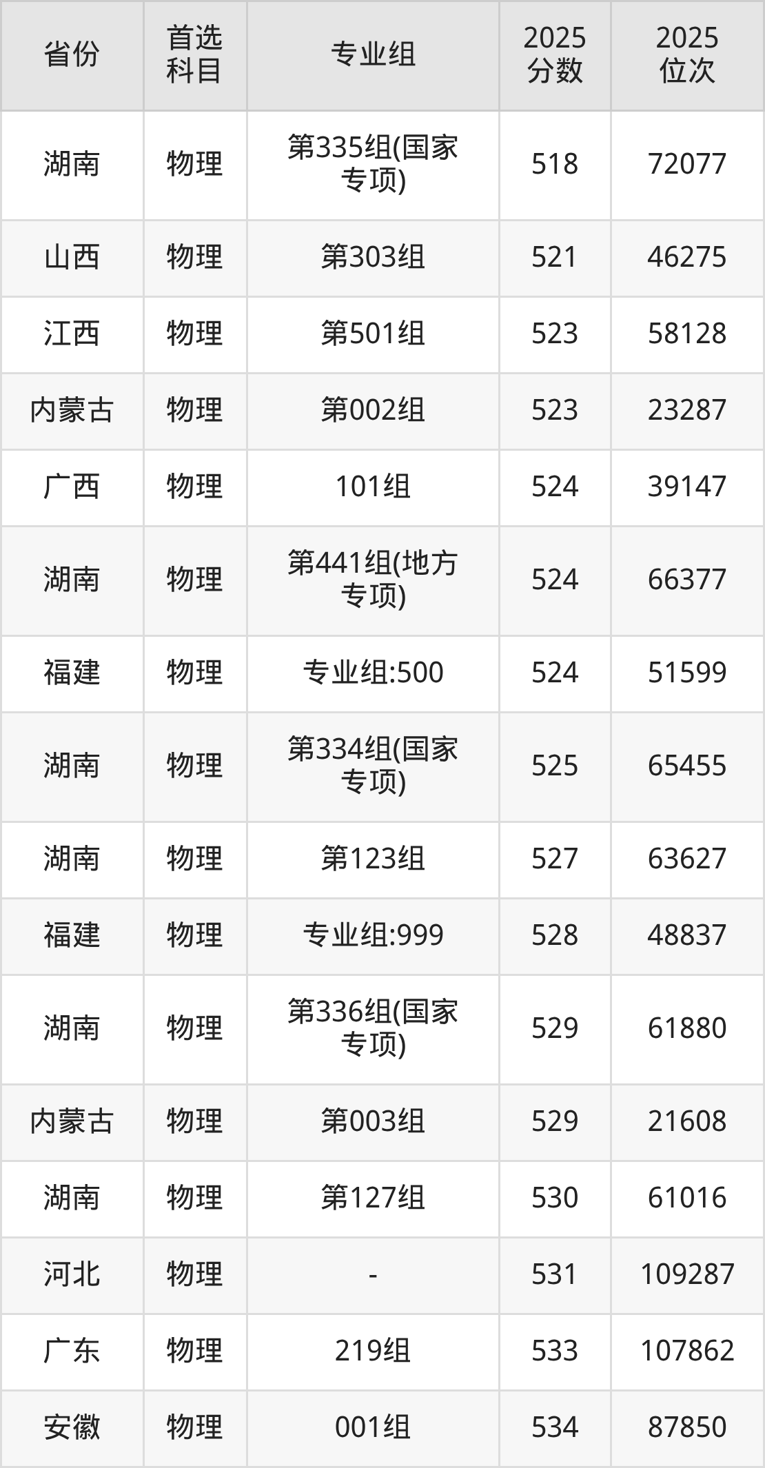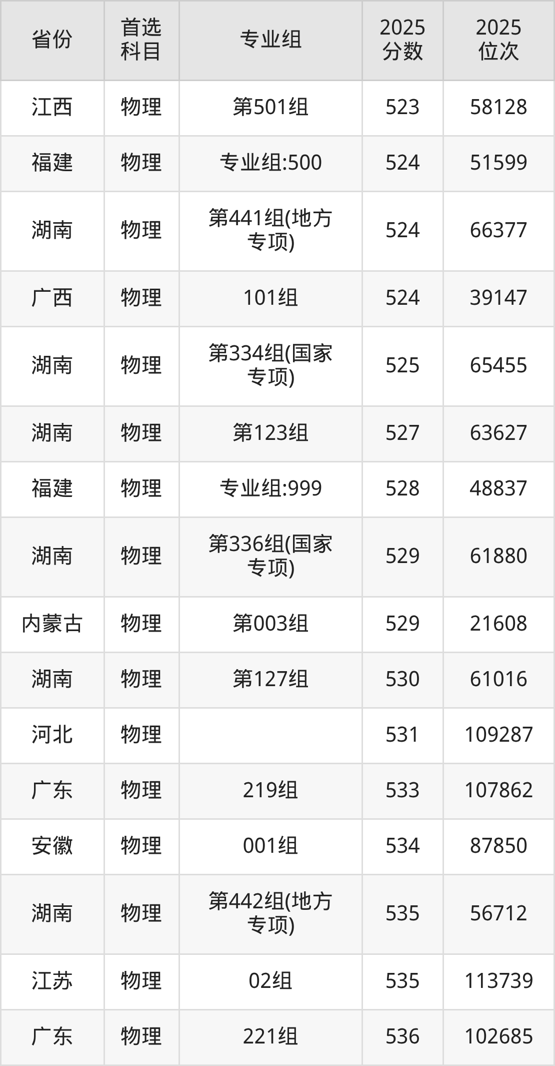 物理类:第139组540分、48925名,第140组544分、45813名,第141组537分、51364名,第142组541分、48114名,第143组545分、44998名,第344组(国家专项)524分、63033名,第345组(国家专项)522分、64971名,第346组(国家专项)536分、52227名,第347组(国家专项)542分、47367名,第448组(地方专项)532分、55697名,第449组(地方专项)530分、57491名,第450组(地方专项)538分、50562名,第451组(地方专项)539分、49746名;