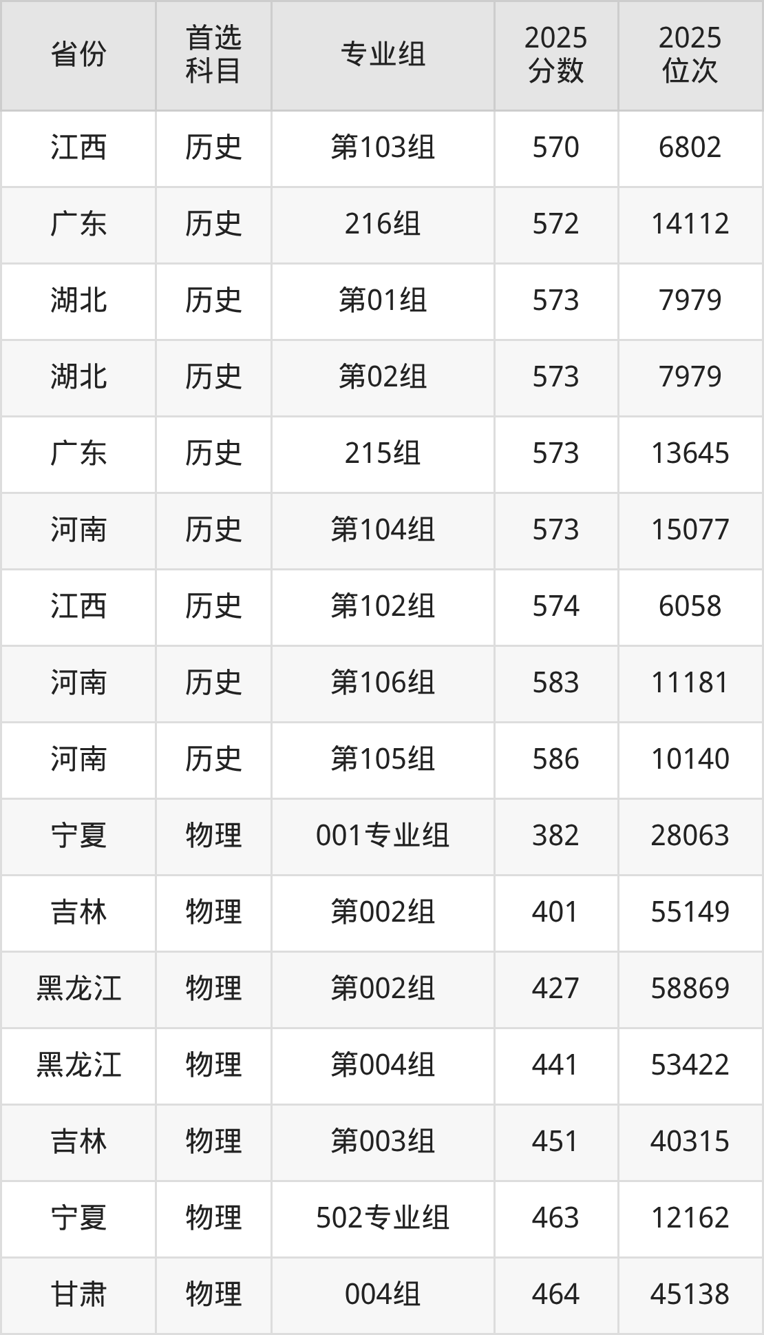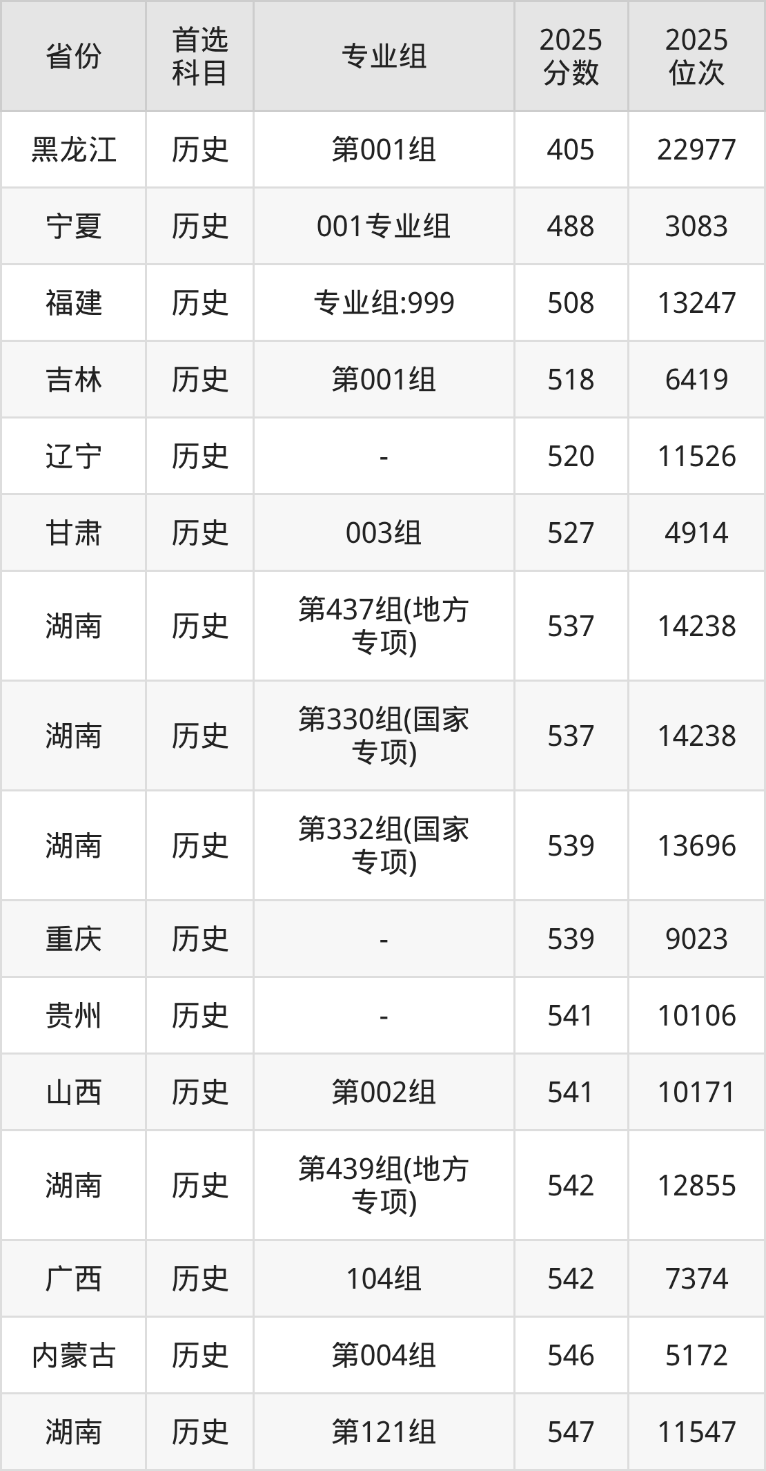 历史类:第129组541分、11312名,第130组549分、9524名,第131组542分、11070名,第332组(国家专项)539分、11826名,第333组(国家专项)549分、9524名,第334组(国家专项)542分、11070名,第435组(地方专项)543分、10828名,第436组(地方专项)552分、8858名,第437组(地方专项)544分、10598名;