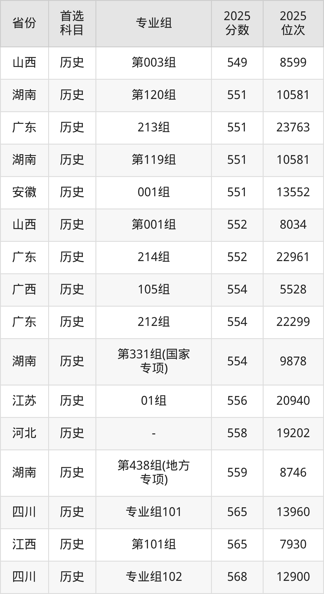 历史类:第119组551分、10581名,第120组551分、10581名,第121组547分、11547名,第330组(国家专项)537分、14238名,第331组(国家专项)554分、9878名,第332组(国家专项)539分、13696名,第437组(地方专项)537分、14238名,第438组(地方专项)559分、8746名,第439组(地方专项)542分、12855名;