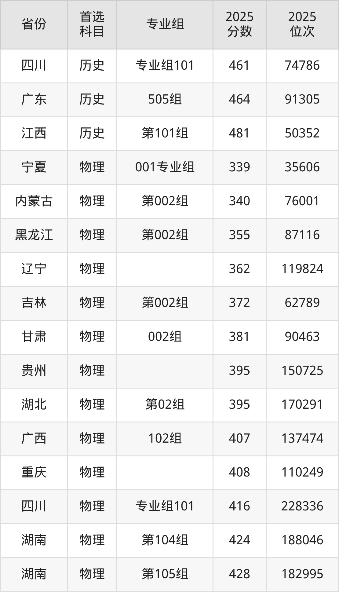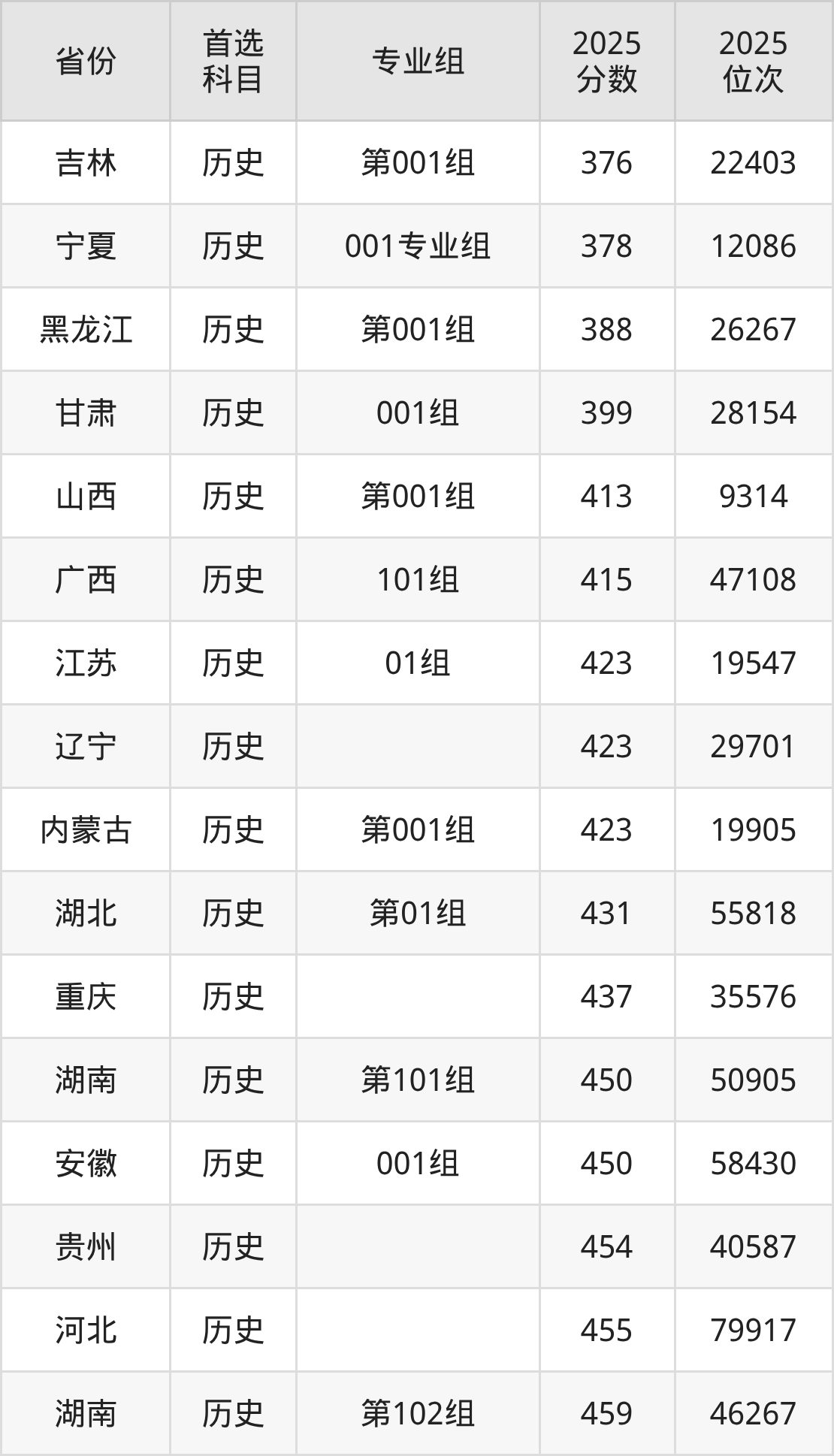 历史类最低分对应地区为吉林(第001组),录取位次为22403,超专科线216分;最高分对应地区为江西(第101组),录取位次为50352,超专科线191分。