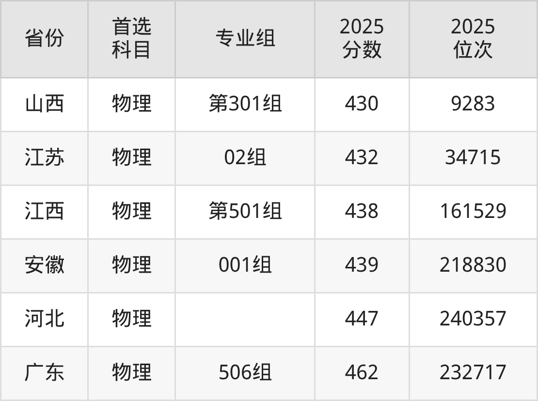 物理类最低分对应地区为宁夏(001专业组),录取位次为35606,超专科线189分;最高分对应地区为广东(506组),录取位次为232717,超专科线262分。