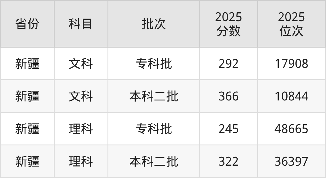 2025年新疆交通职业技术大学在旧高考地区的录取分数线为:文科292分-366分、理科245分-322分。