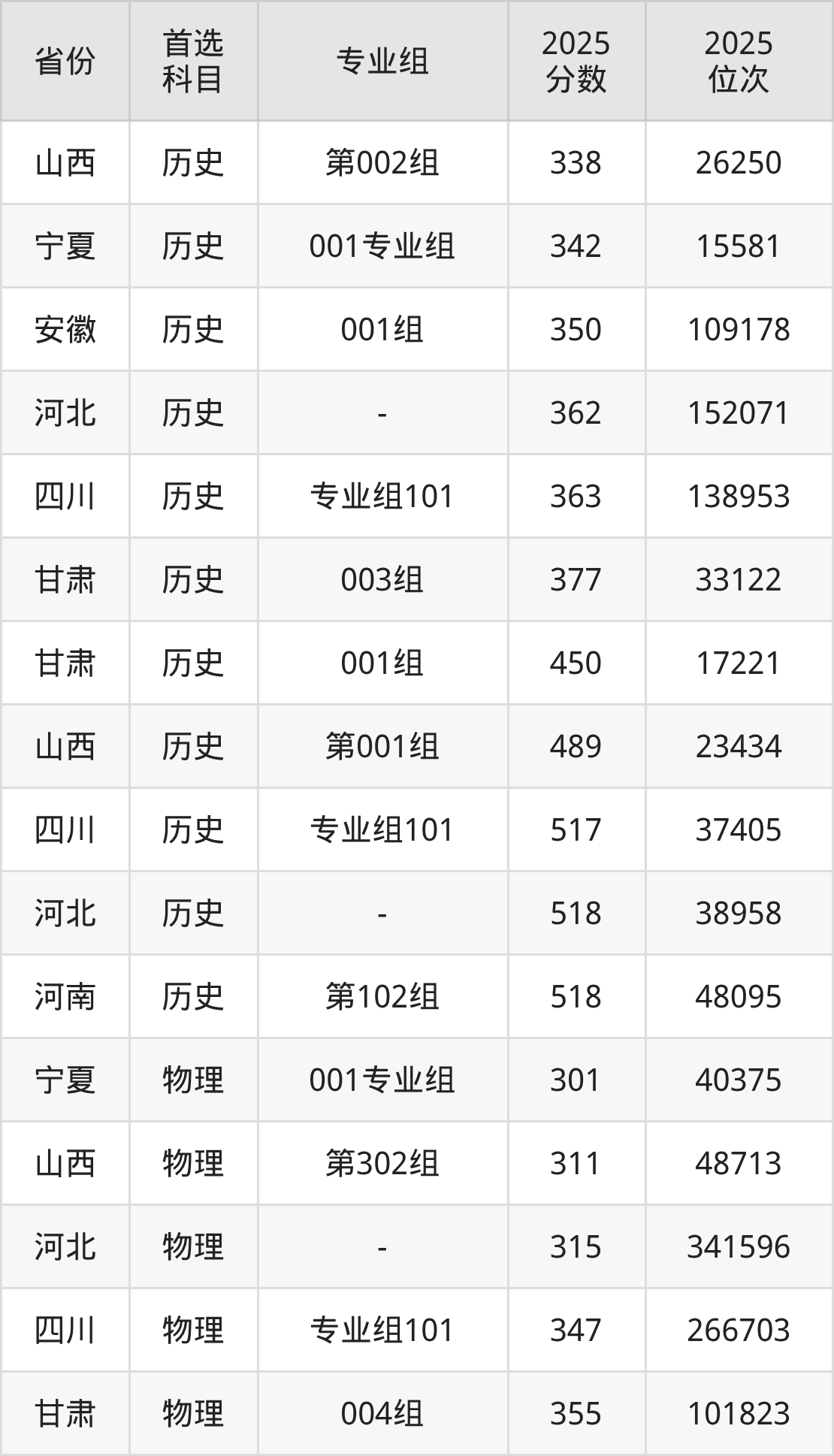历史类最低分对应地区为山西(第002组),录取位次为26250,超专科线238分;最高分对应地区为河南(第102组),录取位次为48095,超本科线47分。