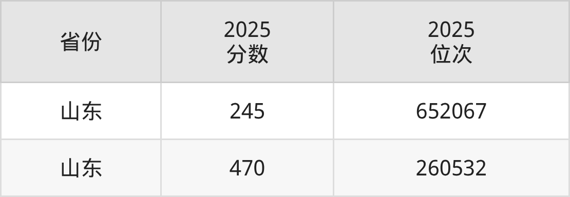 最低分对应地区为山东,录取位次为652067,超二段线95分;最高分对应地区为山东,录取位次为260532,超一段线59分。