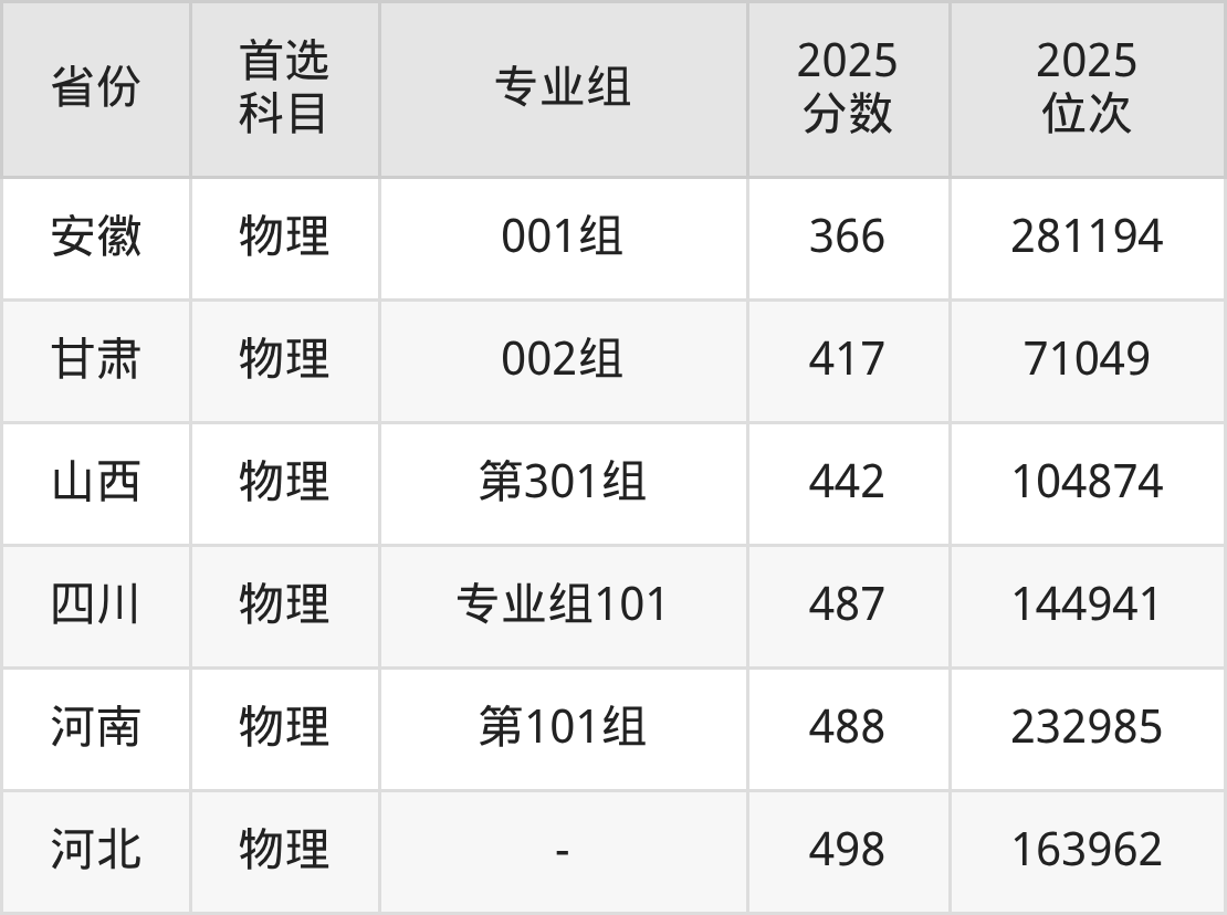 物理类最低分对应地区为宁夏(001专业组),录取位次为40375,超专科线151分;最高分对应地区为河北,录取位次为163962,超本科线39分。