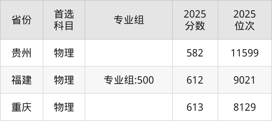 物理类最低分对应地区为贵州,录取位次为11599,超本科线195分;最高分对应地区为重庆,录取位次为8129,超本科线188分。