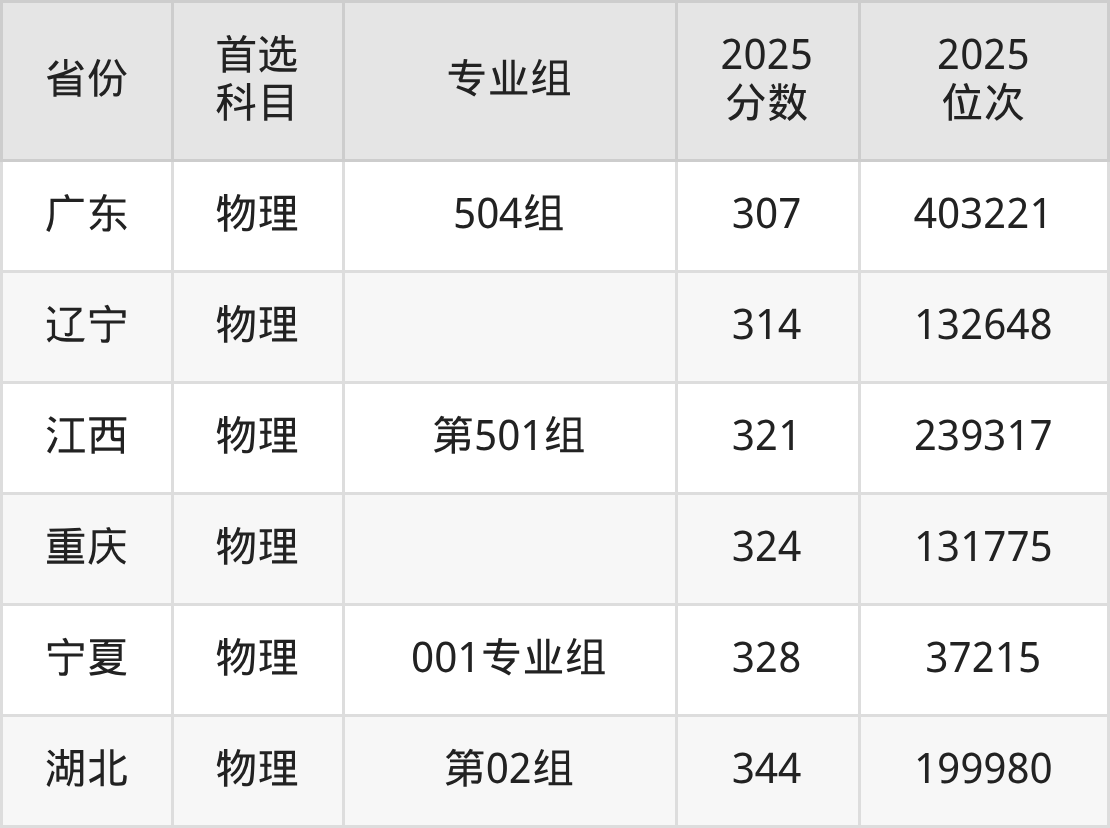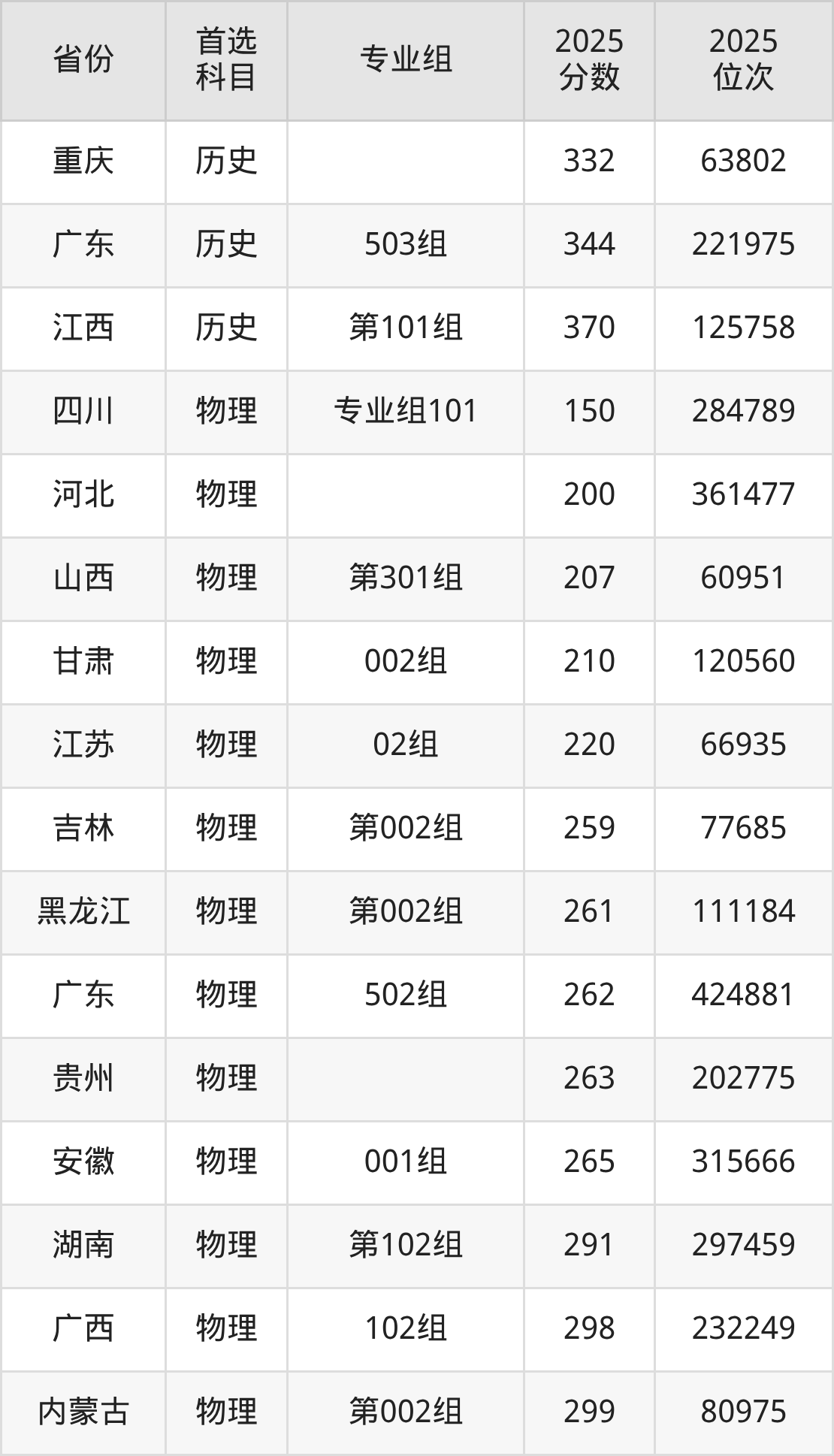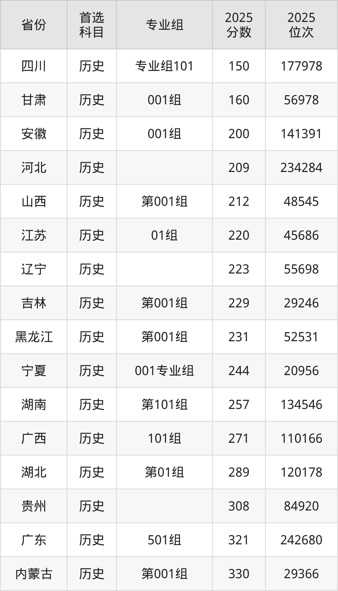 历史类最低分对应地区为四川(专业组101),录取位次为177978;最高分对应地区为江西(第101组),录取位次为125758。