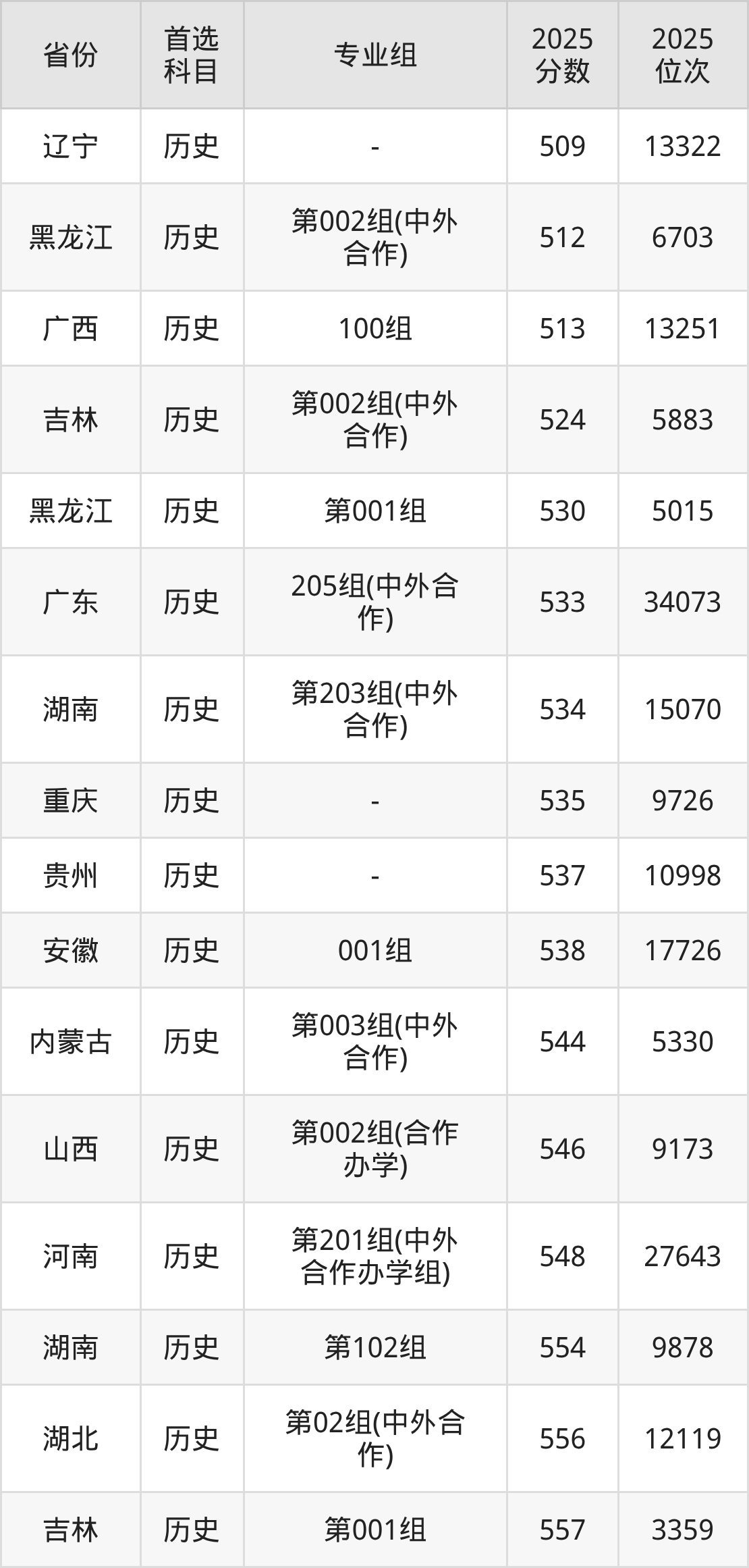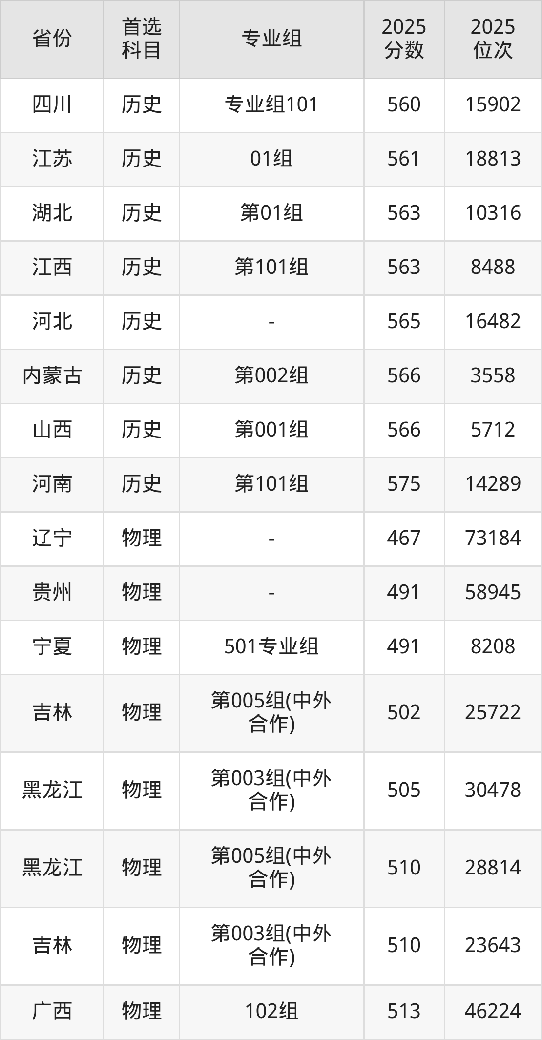 历史类最低分对应地区为辽宁,录取位次为13322,超本科线72分;最高分对应地区为河南(第101组),录取位次为14289,超本科线104分。
