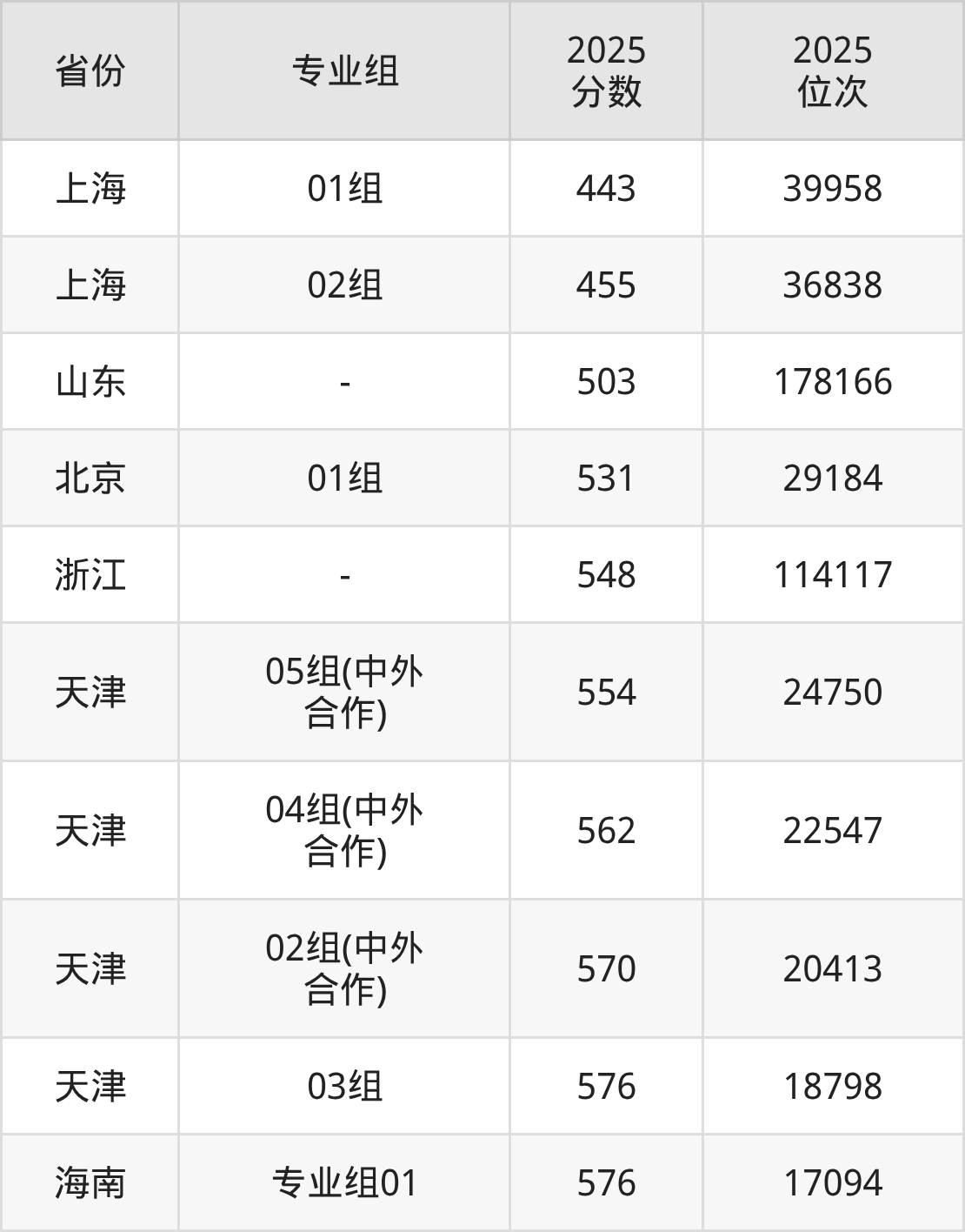 最低分对应地区为上海(01组),录取位次为39958,超本科线41分;最高分对应地区为海南(专业组01),录取位次为17094,超本科线96分。