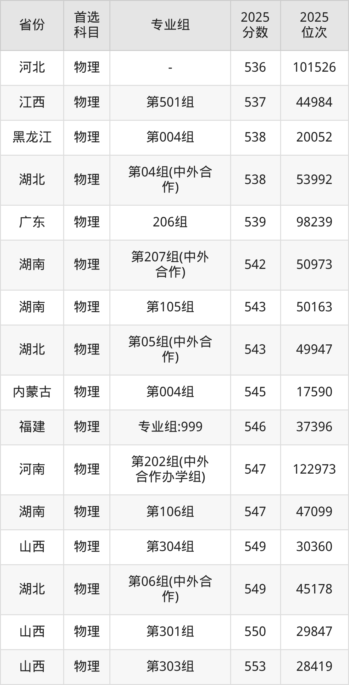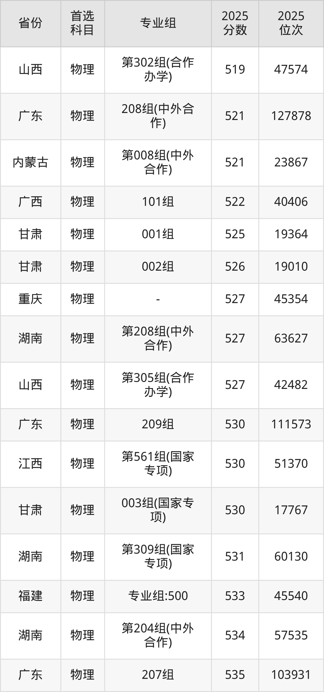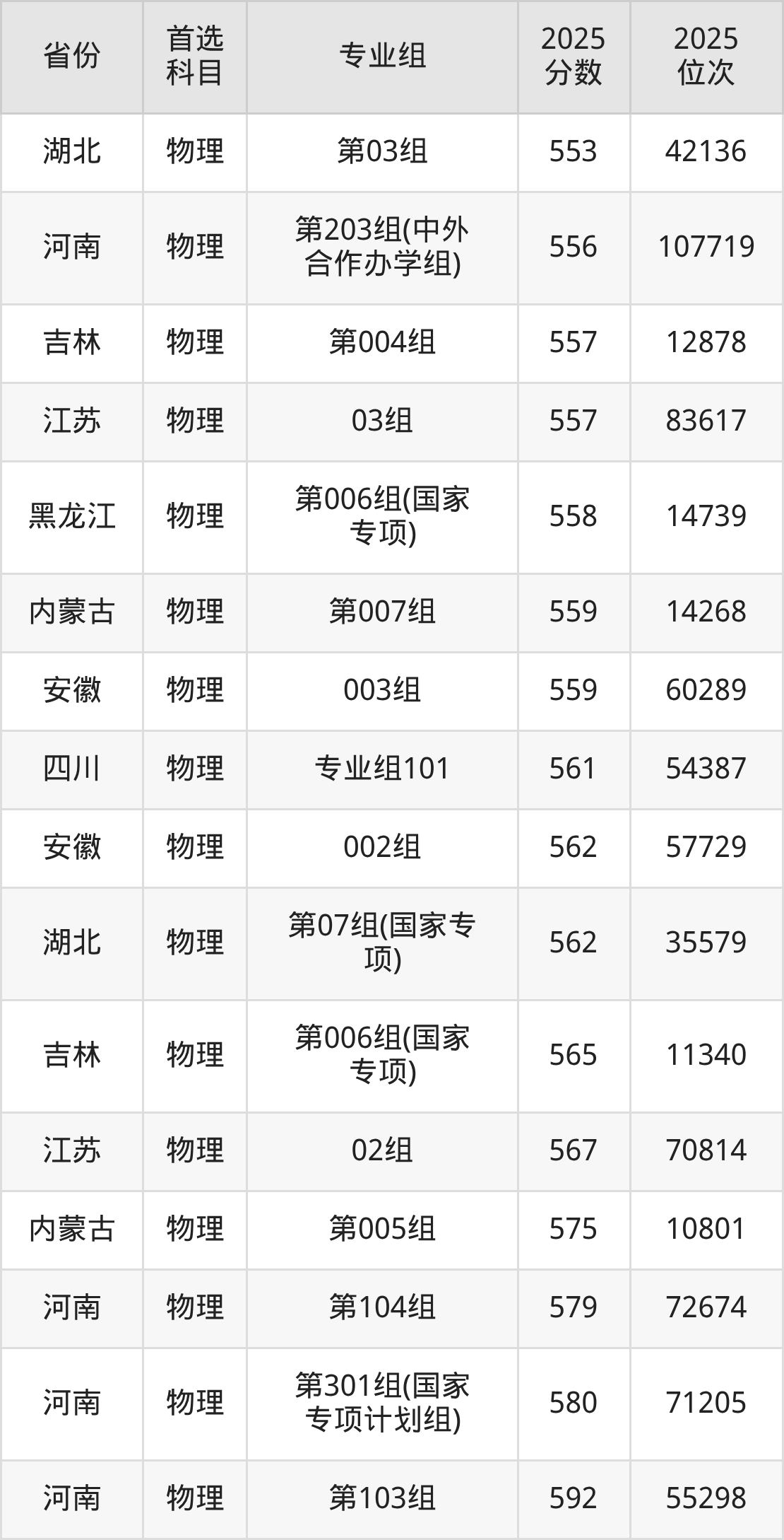 物理类最低分对应地区为辽宁,录取位次为73184;最高分对应地区为河南(第105组),录取位次为47010,超本科线172分。