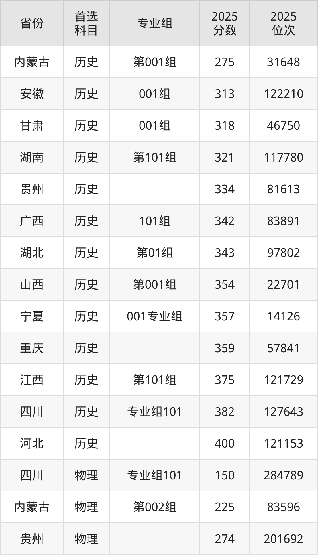 历史类最低分对应地区为内蒙古(第001组),录取位次为31648,超专科线115分;最高分对应地区为河北,录取位次为121153。