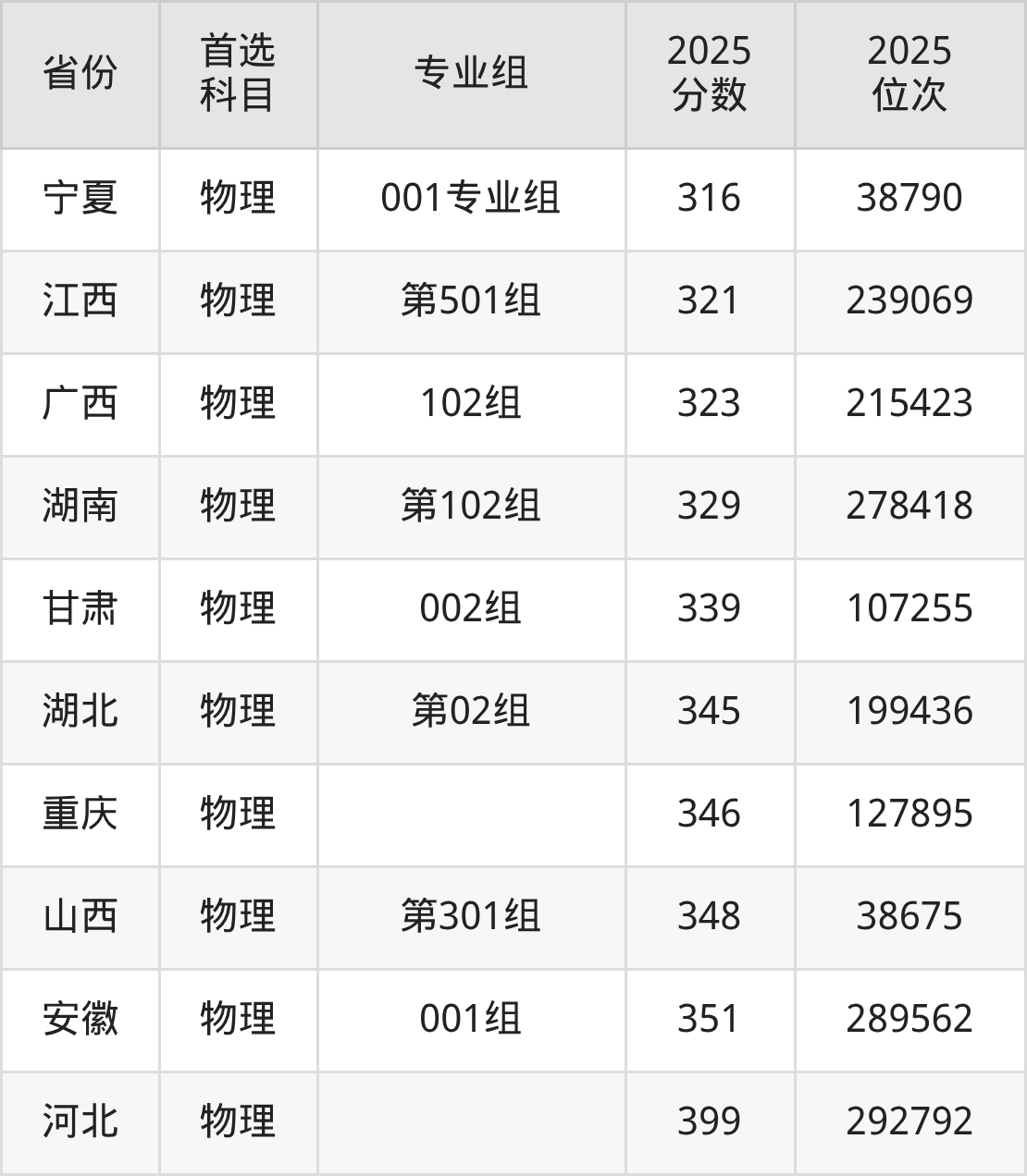 物理类最低分对应地区为四川(专业组101),录取位次为284789;最高分对应地区为河北,录取位次为292792,超专科线199分。