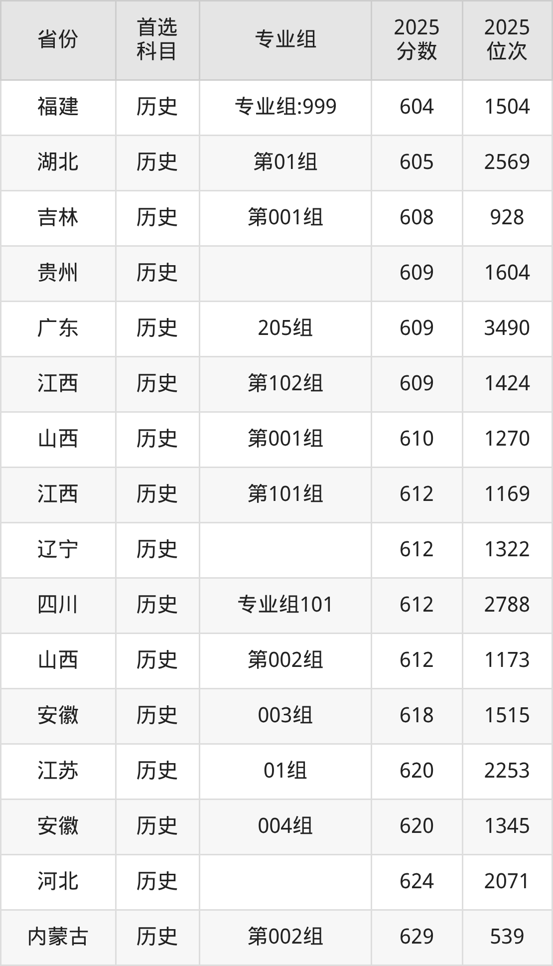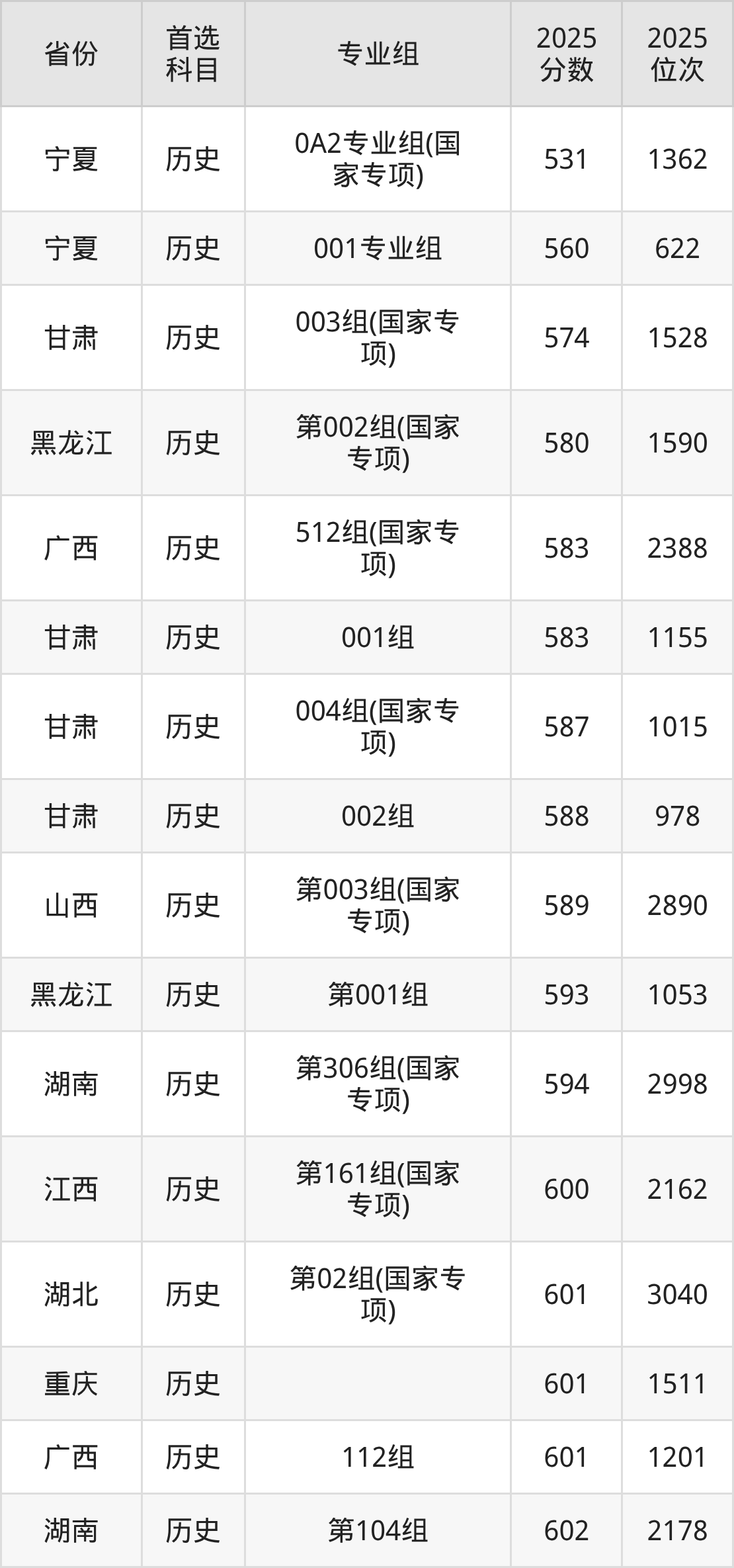 历史类最低分对应地区为宁夏(0A2专业组(国家专项)),录取位次为1362,超本科B127分;最高分对应地区为内蒙古(第002组),录取位次为539,超本科线211分。