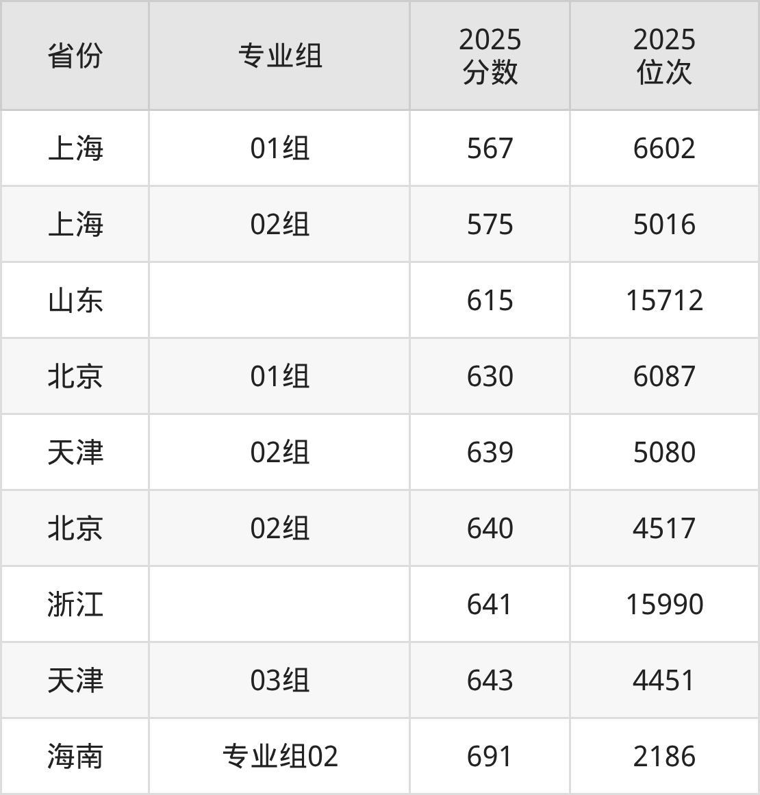 最低分对应地区为上海(01组),录取位次为6602,超本科线165分;最高分对应地区为海南(专业组02),录取位次为2186,超本科线211分。