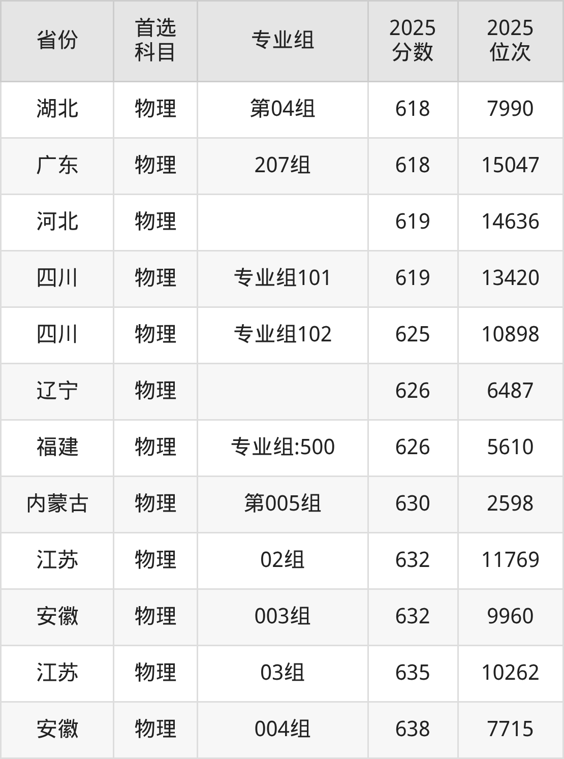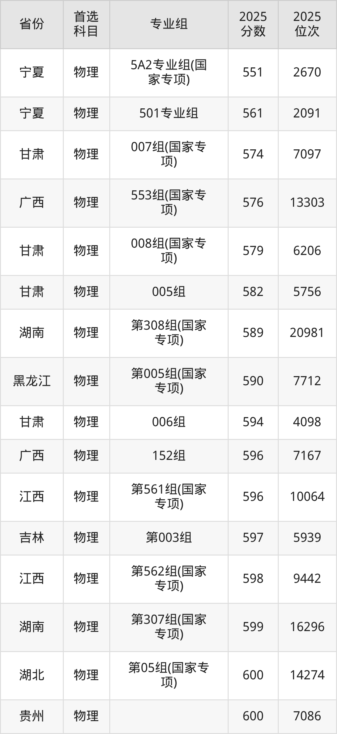 物理类最低分对应地区为宁夏(5A2专业组(国家专项)),录取位次为2670,超本科B179分;最高分对应地区为安徽(004组),录取位次为7715,超本科线177分。