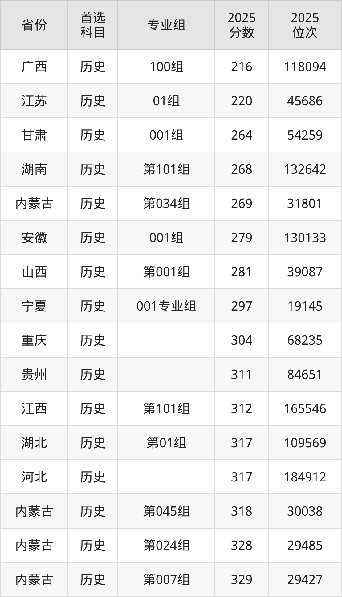 历史类最低分对应地区为广西(100组),录取位次为118094,超专科线16分;最高分对应地区为内蒙古(第004组),录取位次为28470,超专科线183分。