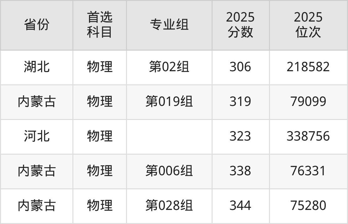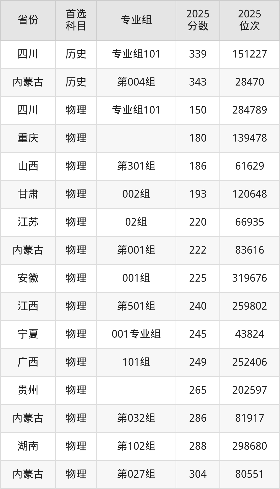 物理类最低分对应地区为四川(专业组101),录取位次为284789;最高分对应地区为内蒙古(第028组),录取位次为75280,超专科线184分。