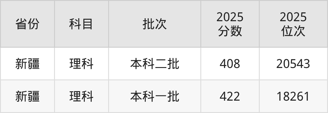 理科最低分对应地区为新疆,录取位次为20543,超二本线128分;最高分对应地区为新疆,录取位次为18261,超一本线1分。