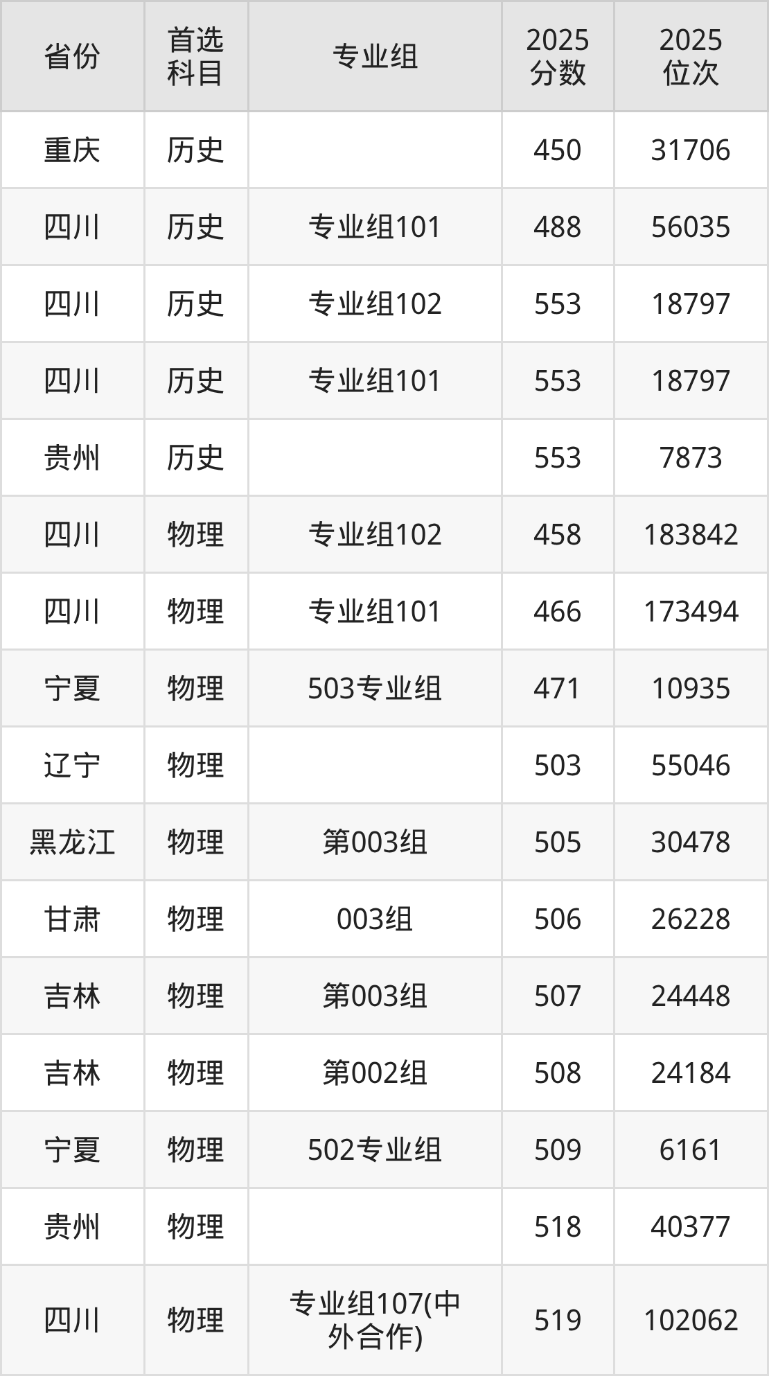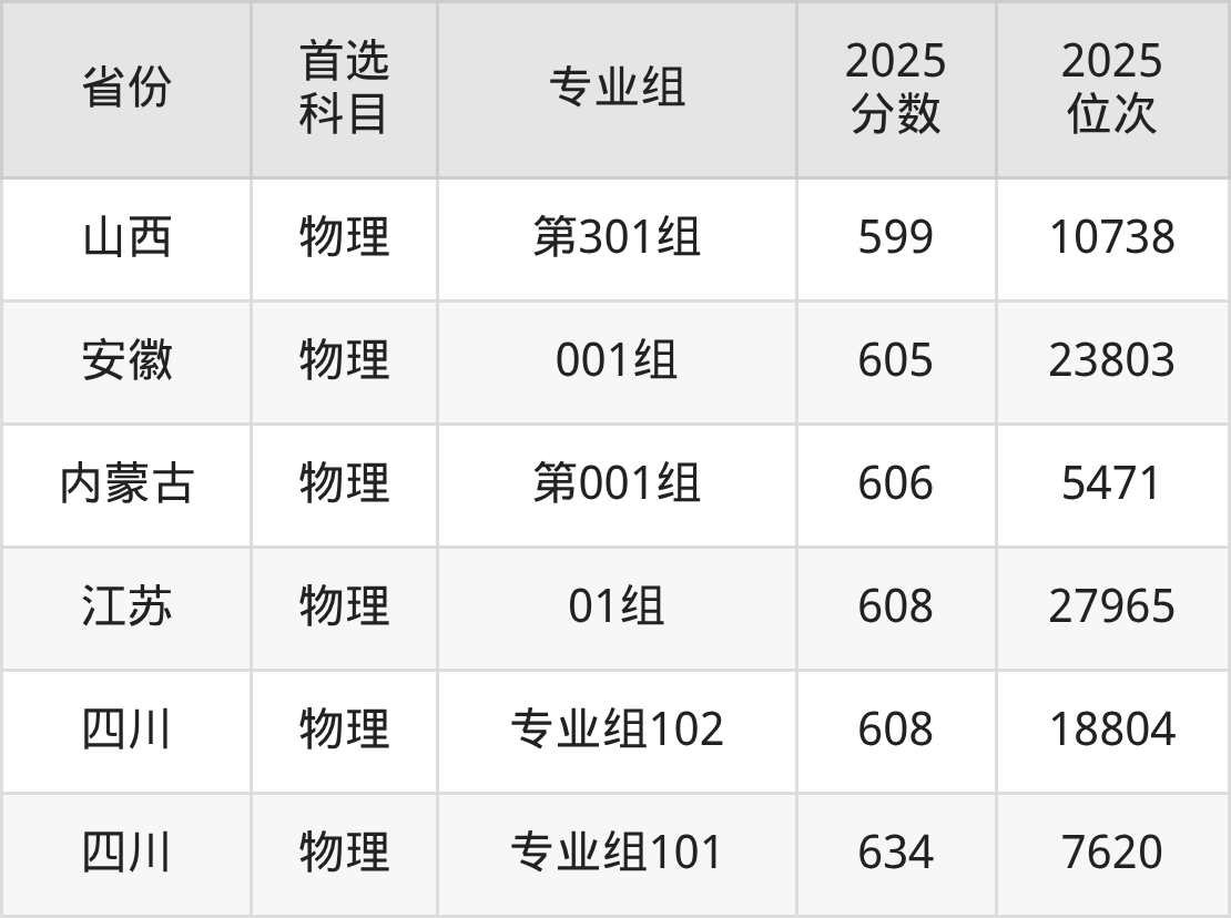 物理类最低分对应地区为四川(专业组102),录取位次为183842,超专科线308分;最高分对应地区为四川(专业组101),录取位次为7620,超本科B196分。