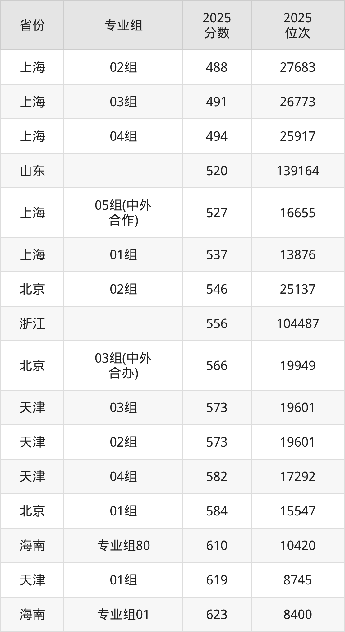 最低分对应地区为上海(02组),录取位次为27683,超本科线86分;最高分对应地区为海南(专业组02),录取位次为3660,超本科线187分。