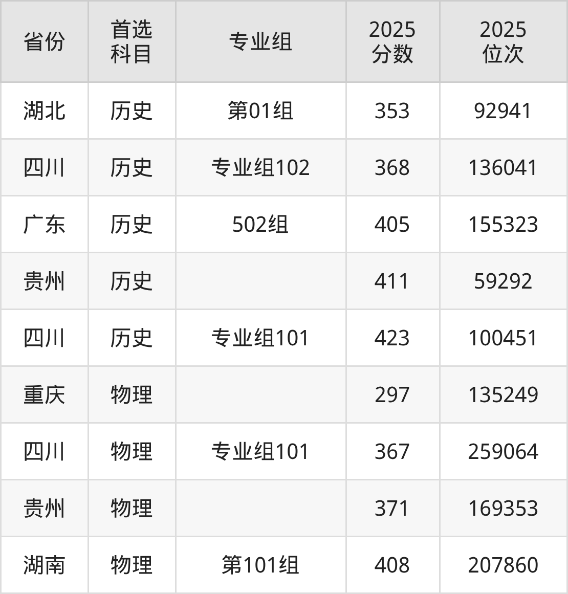 历史类最低分对应地区为湖北(第01组),录取位次为92941,超专科线153分;最高分对应地区为四川(专业组101),录取位次为100451,超专科线273分。
