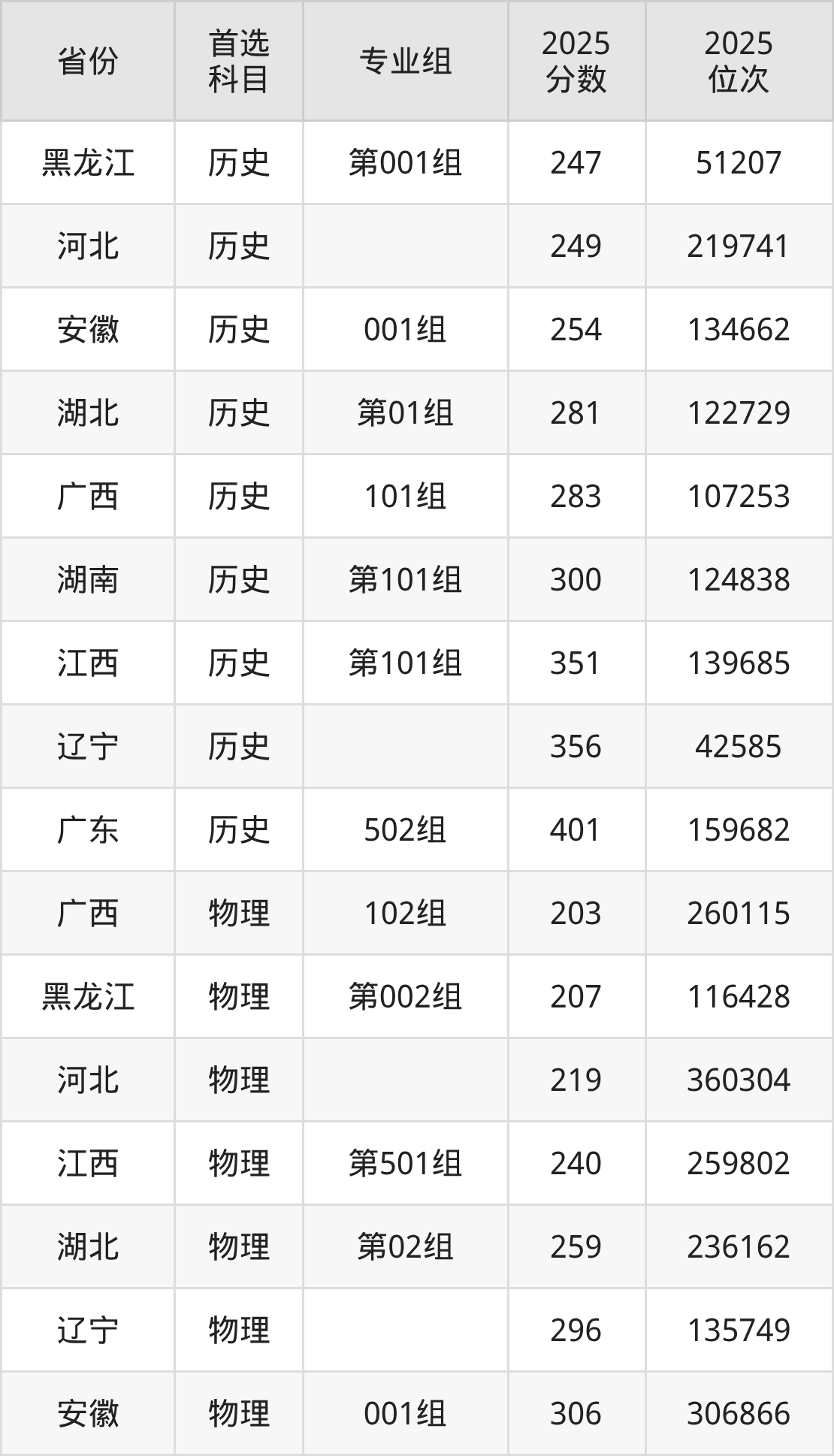历史类最低分对应地区为黑龙江(第001组),录取位次为51207,超专科线87分;最高分对应地区为广东(502组),录取位次为159682,超专科线186分。