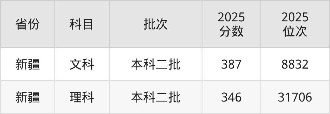 文科最低分对应地区为新疆,录取位次为8832,超二本线57分。