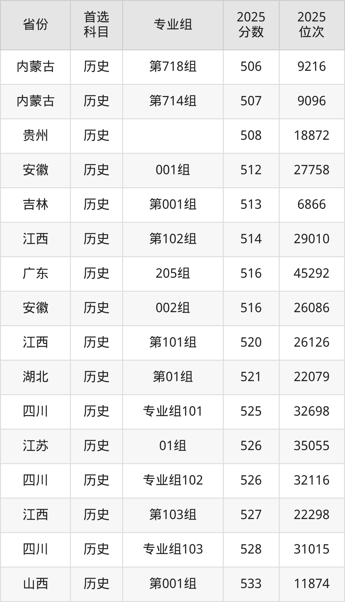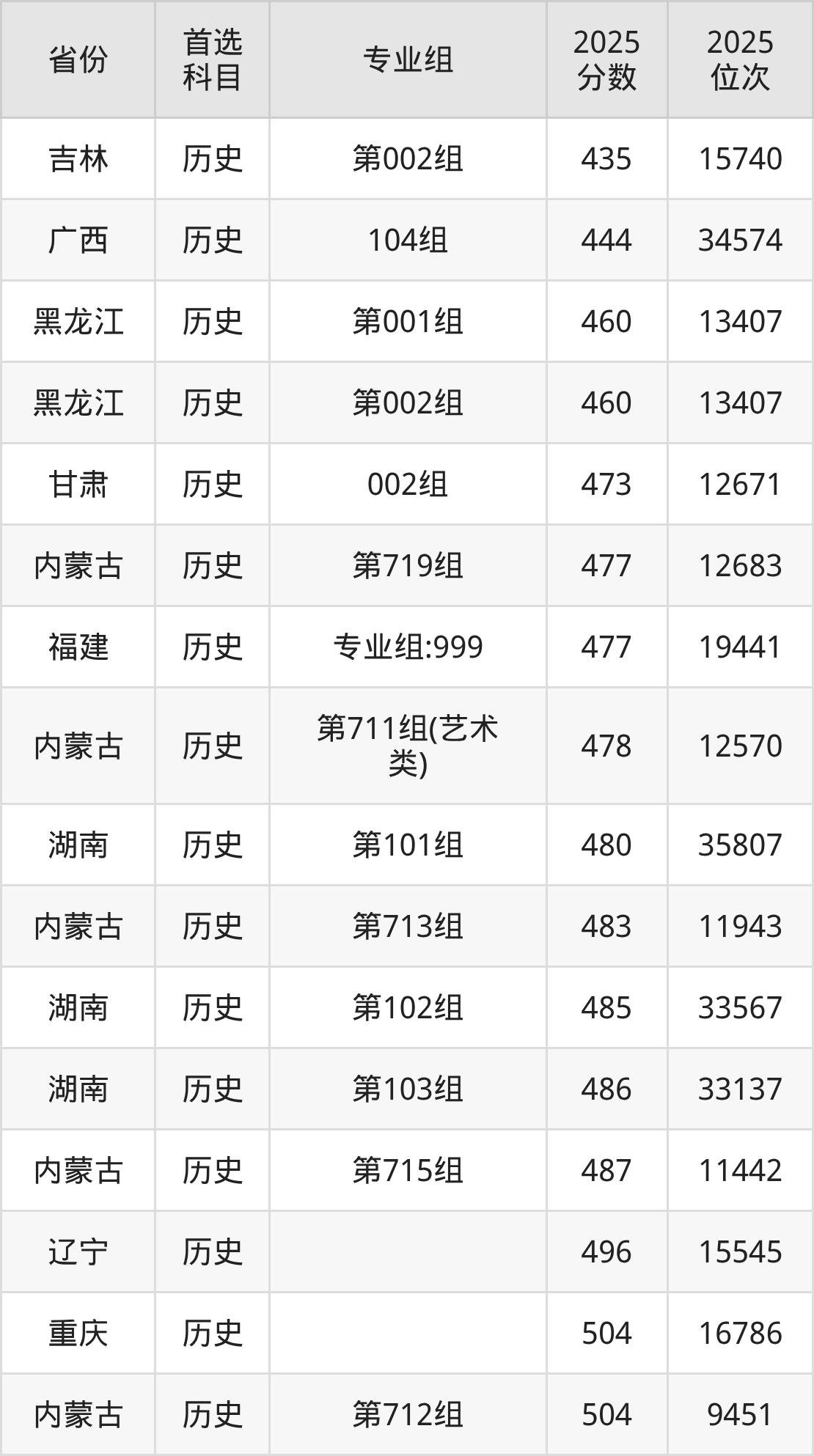 历史类:第710组533分、6310名,第711组(艺术类)478分、12570名,第712组504分、9451名,第713组483分、11943名,第714组507分、9096名,第715组487分、11442名,第718组506分、9216名,第719组477分、12683名;