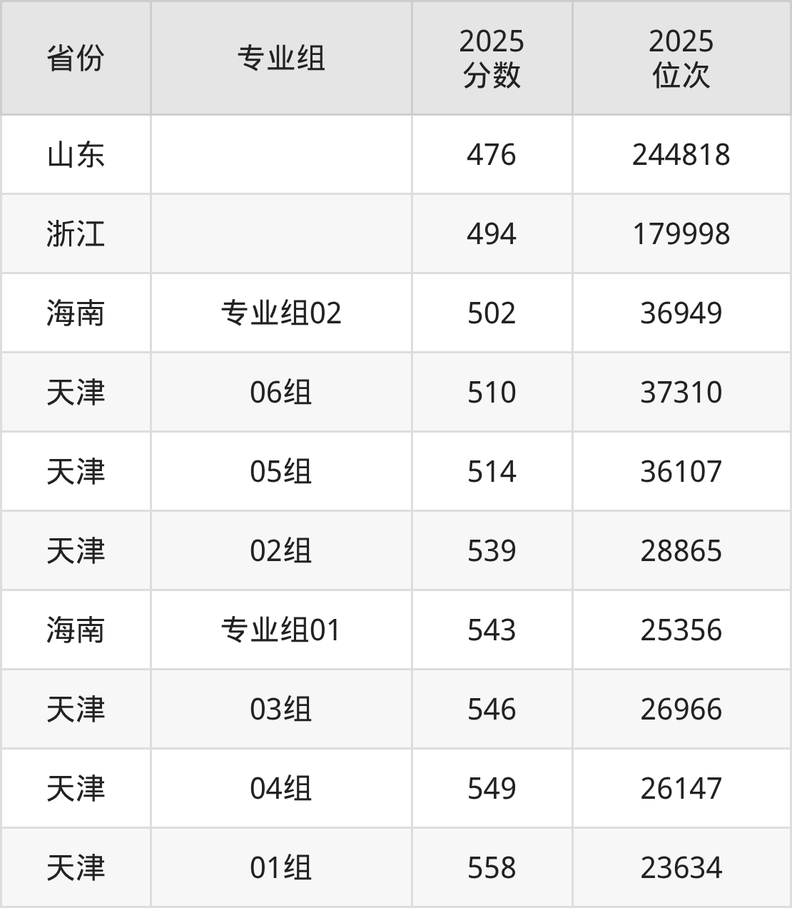 最低分对应地区为山东,录取位次为244818,超一段线71分;最高分对应地区为天津(01组),录取位次为23634,超本科线82分。