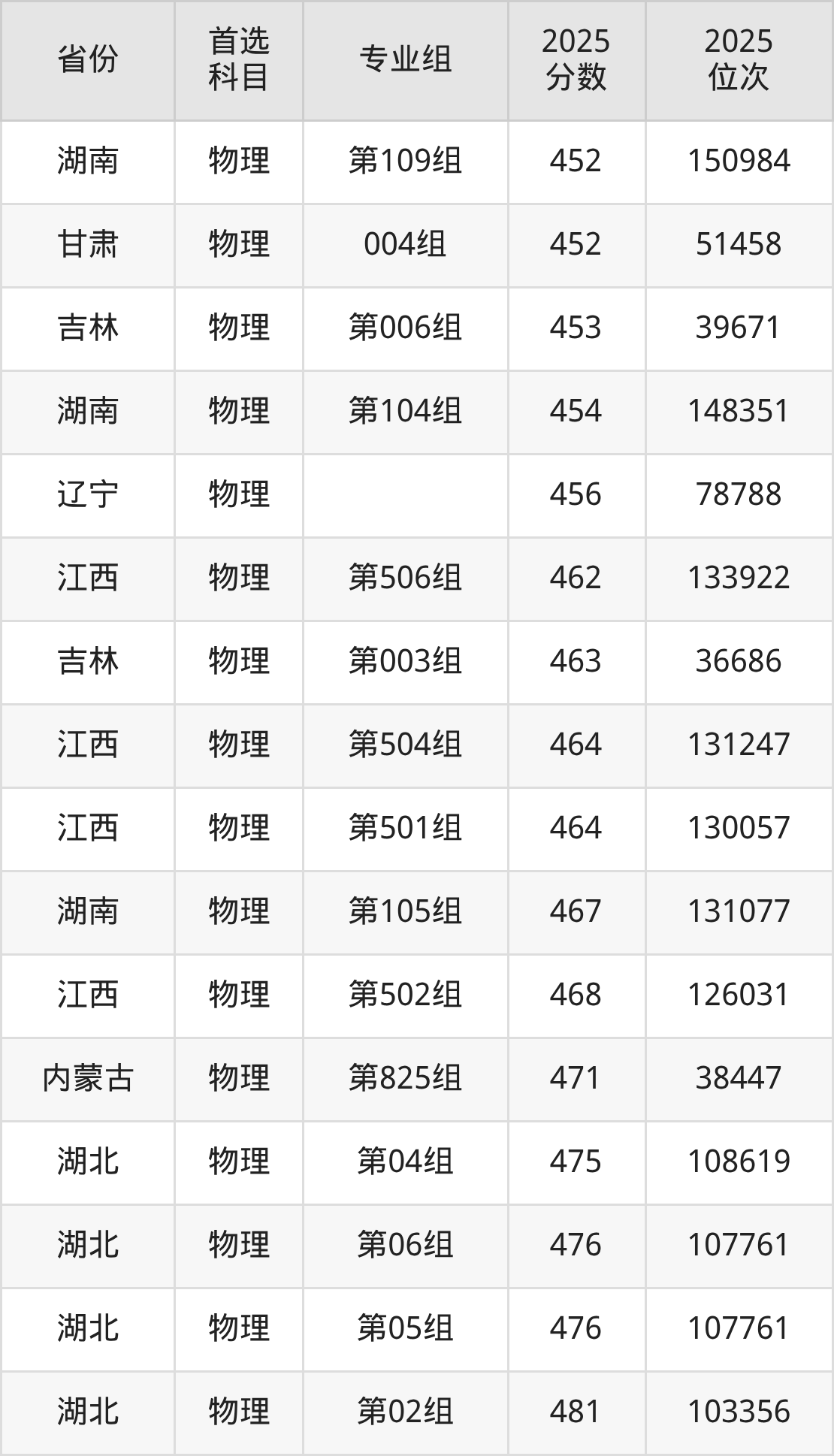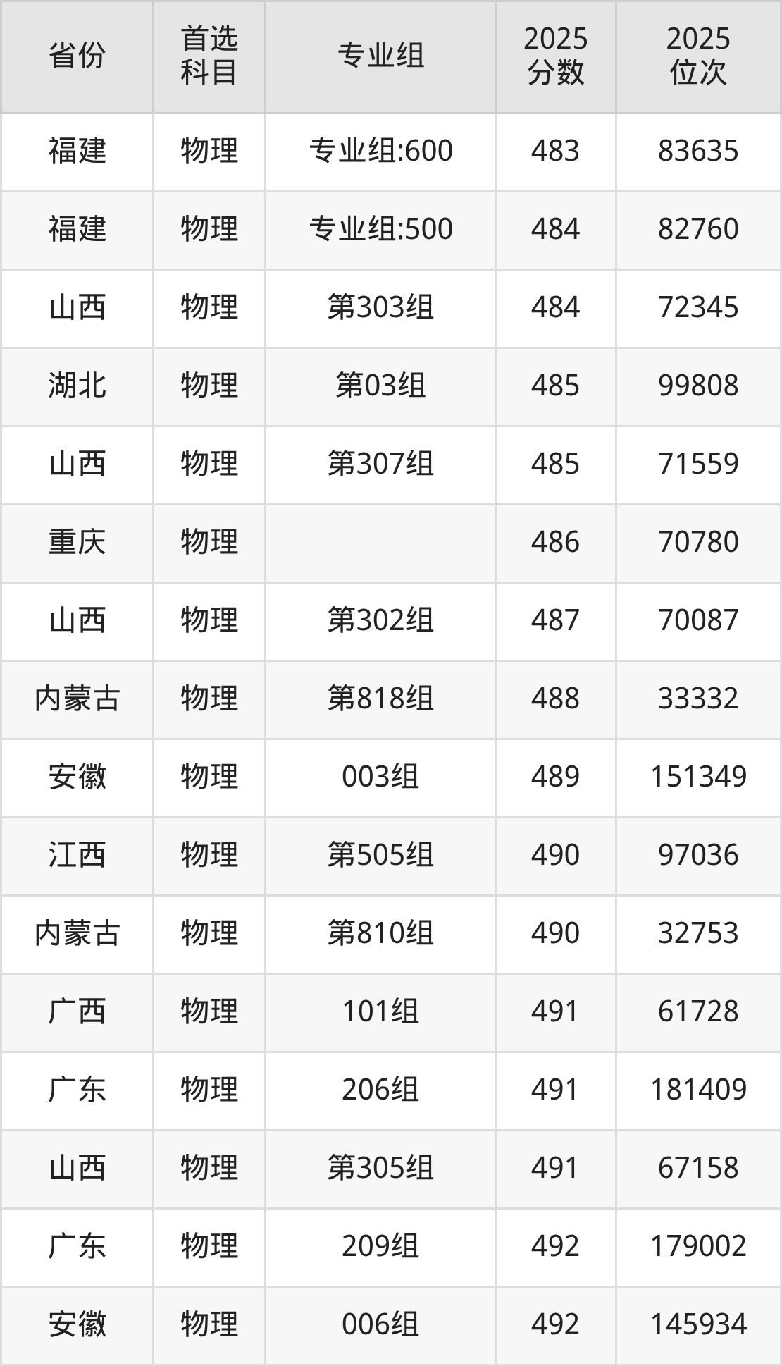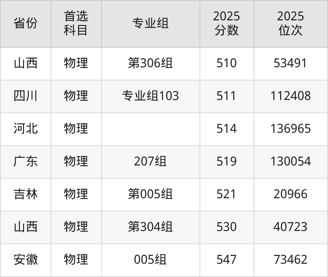 物理类最低分对应地区为吉林(第007组),录取位次为78981;最高分对应地区为安徽(005组),录取位次为73462,超本科线86分。
