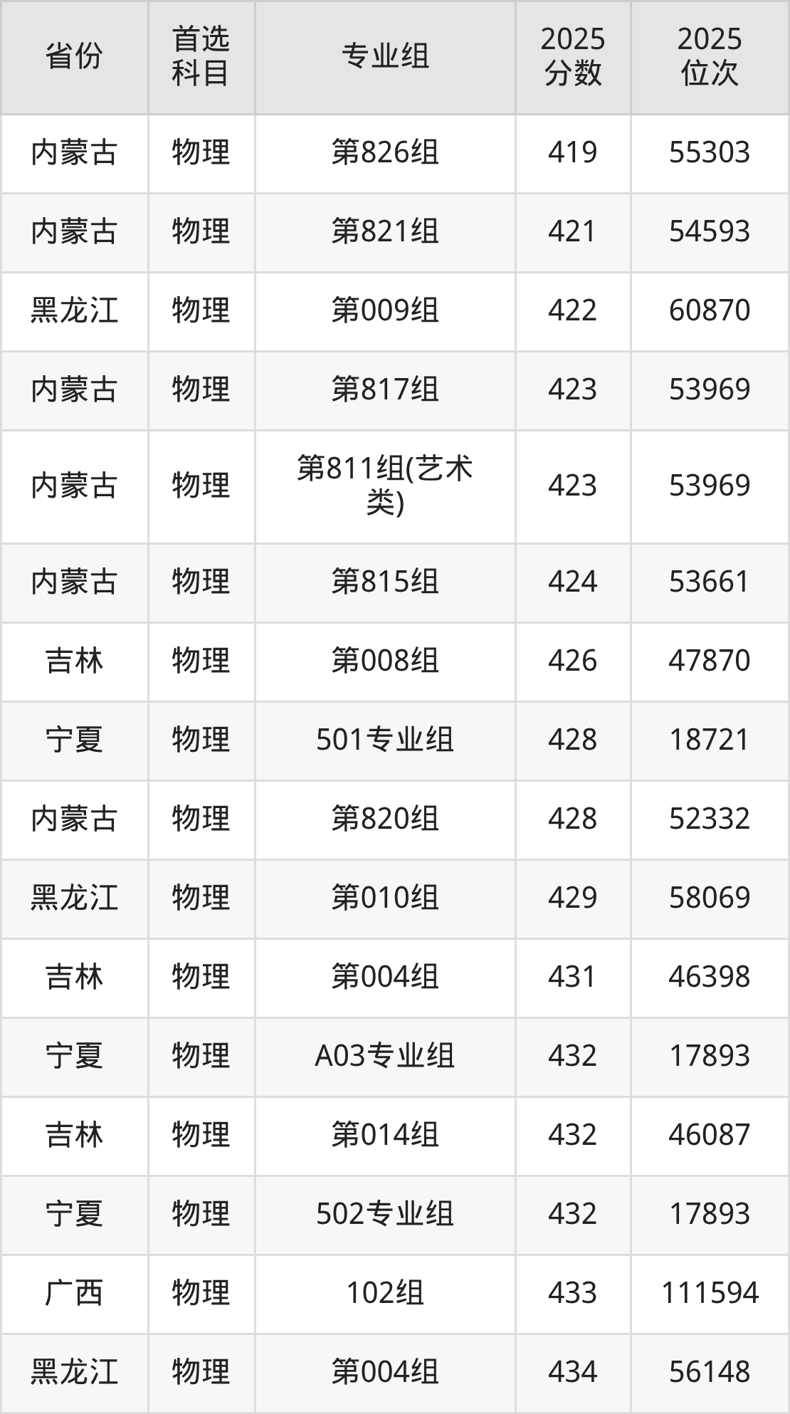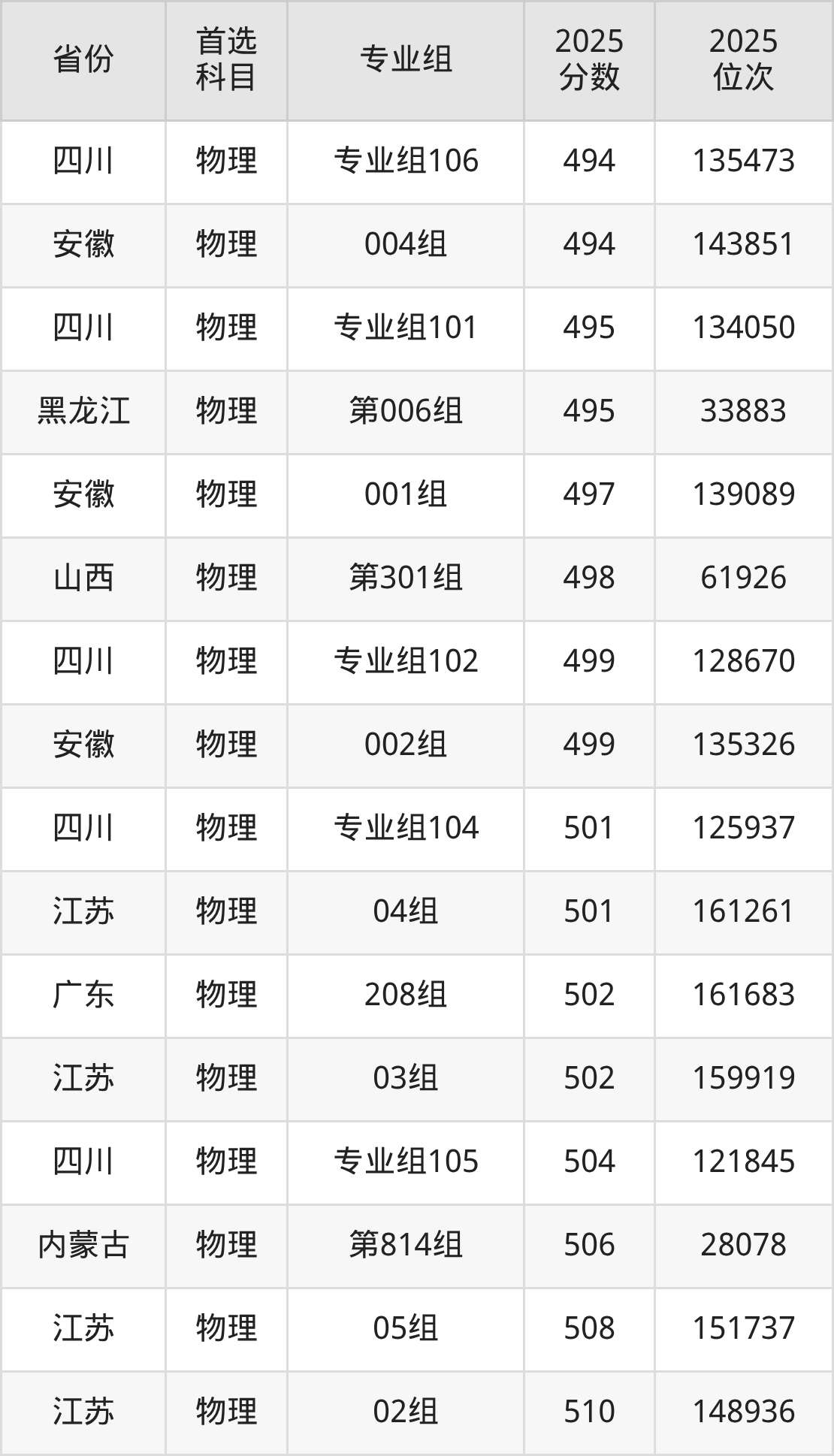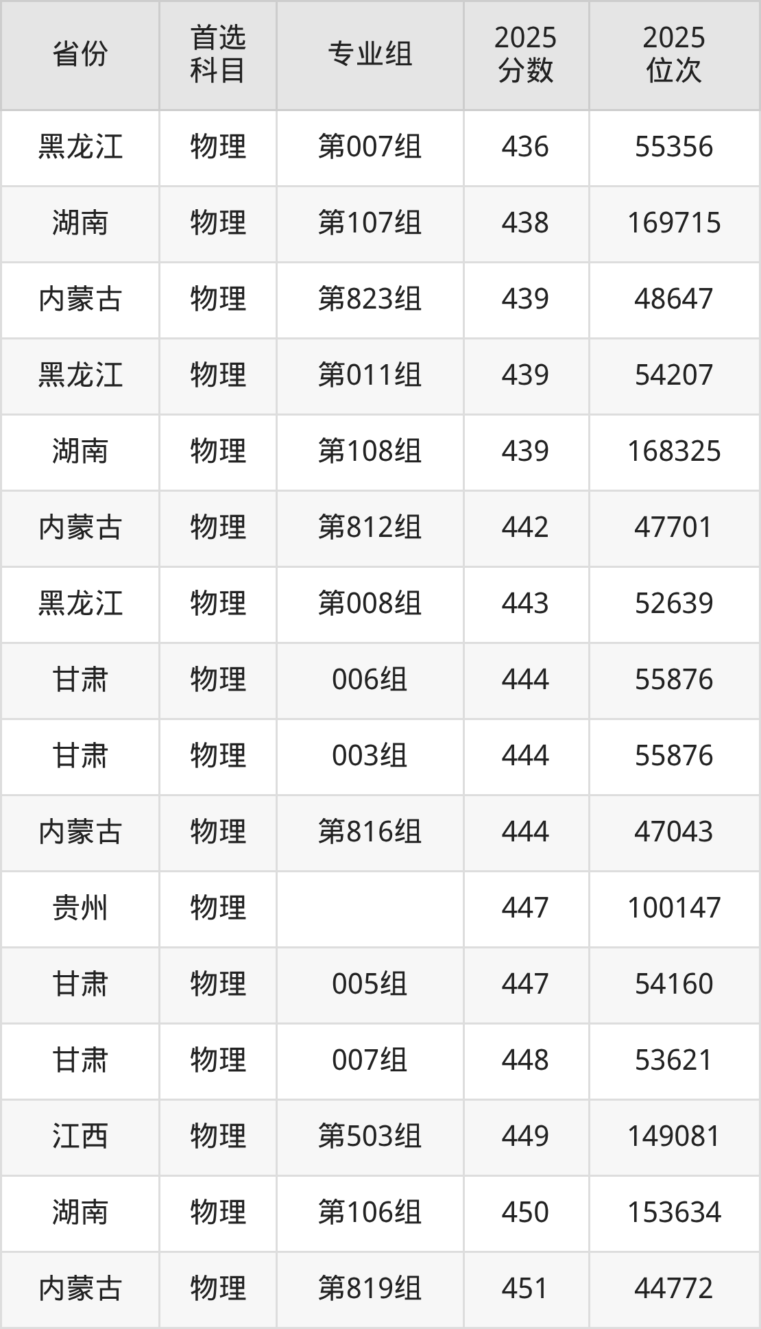 物理类最低分对应地区为吉林(第007组),录取位次为78981;最高分对应地区为安徽(005组),录取位次为73462,超本科线86分。