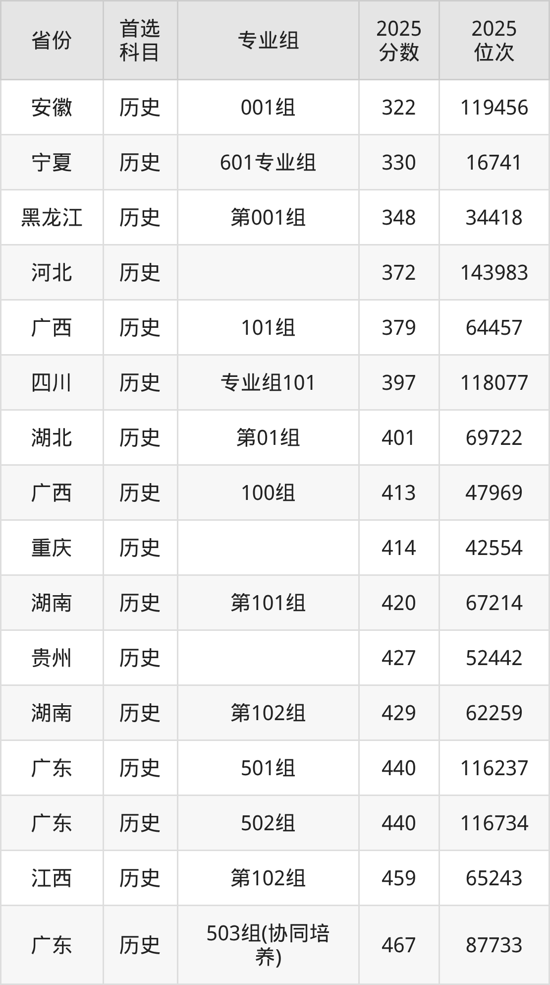 历史类:501组440分、116237名,502组440分、116734名,503组(协同培养)467分、87733名;