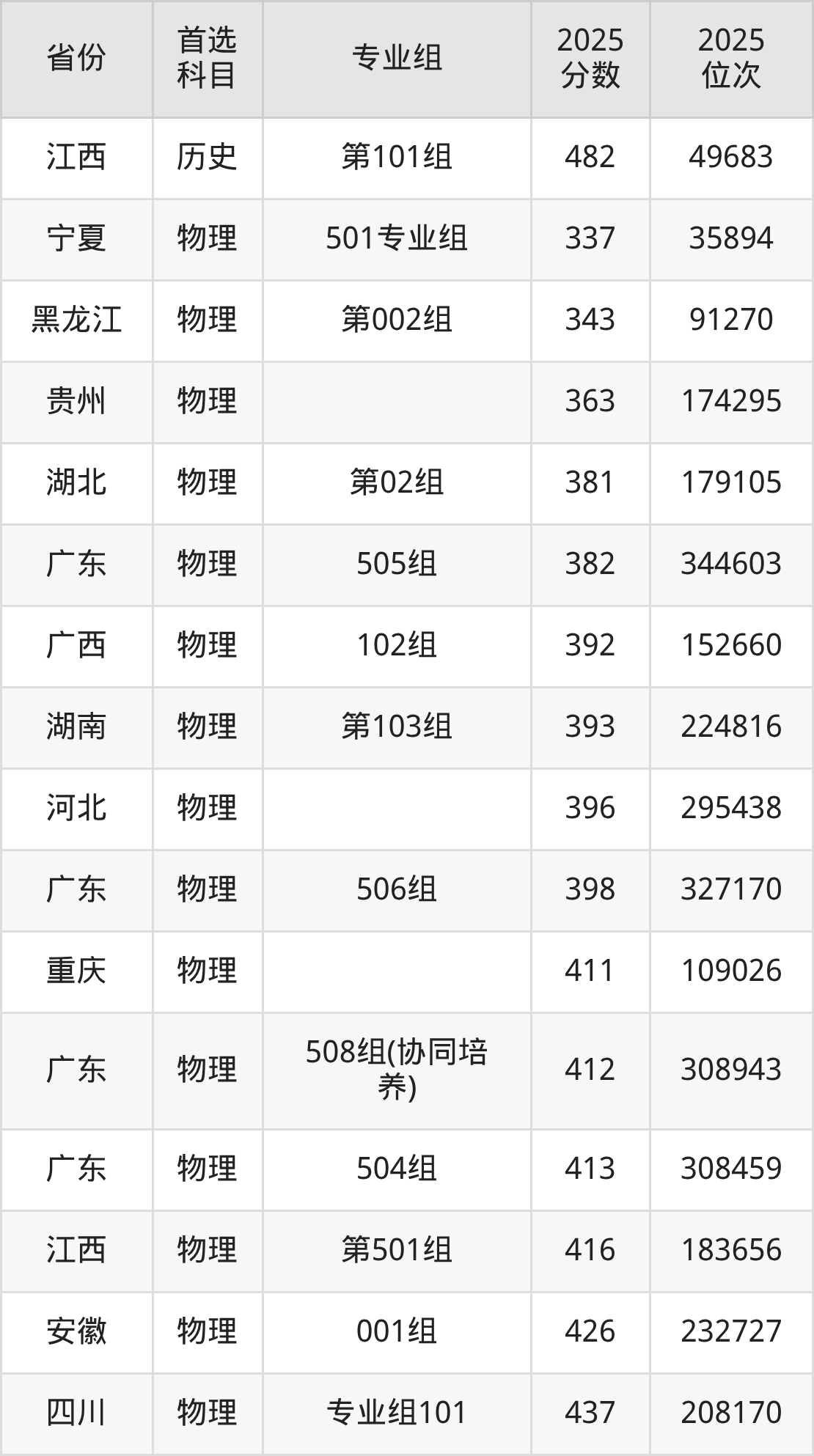 物理类:504组413分、308459名,505组382分、344603名,506组398分、327170名,507组(协同培养)442分、265600名,508组(协同培养)412分、308943名;